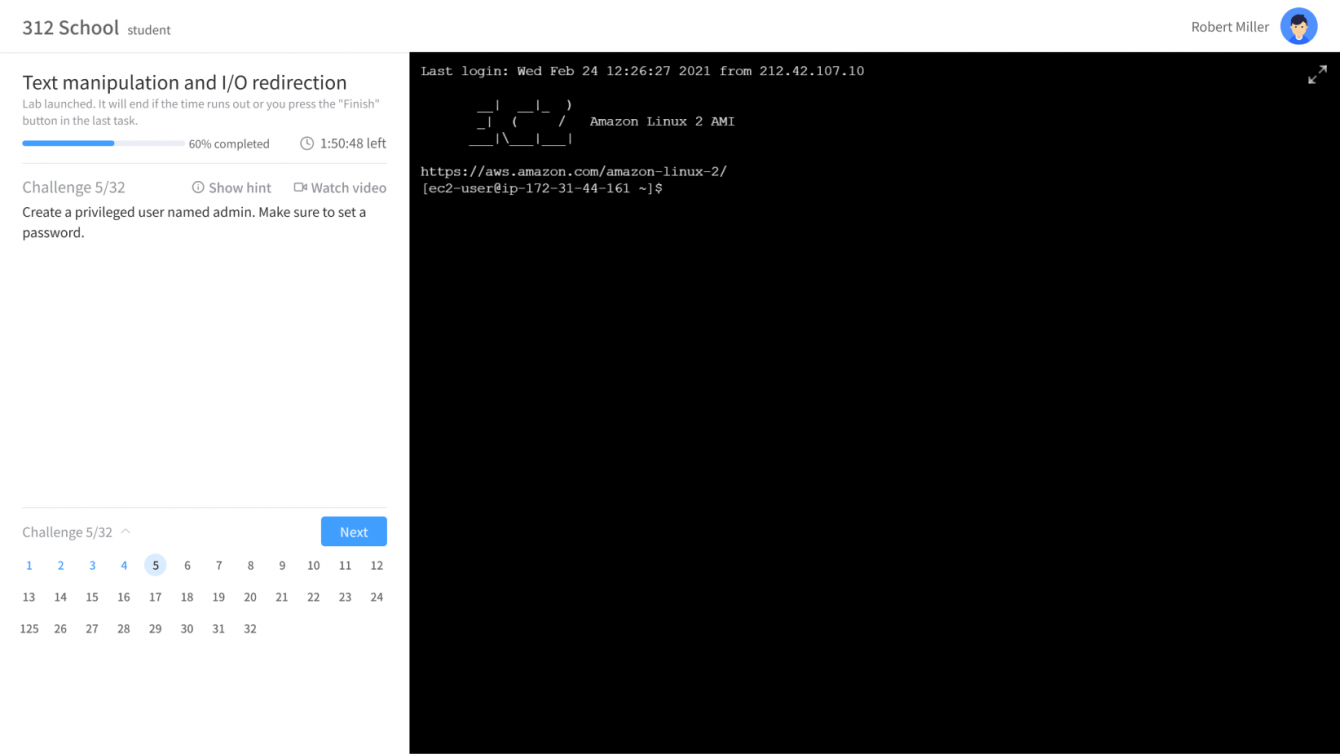 Терминал, подключенный к серверам AWS, принадлежащим школе, т.е. в процессе работы студент выполняет задание во внутренней среде школы (справа).