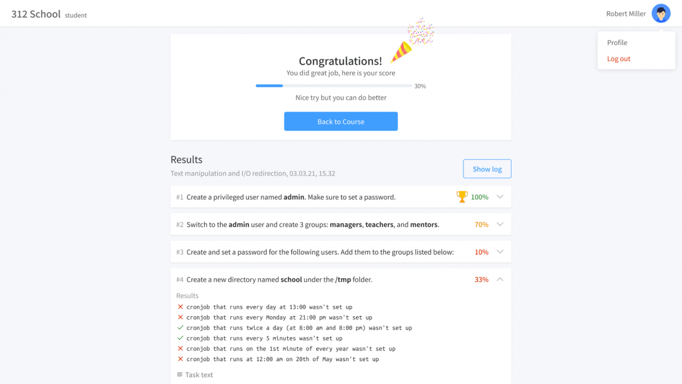 Как только студент завершает работу, содержимое его консоли отправляется на сервер, после чего обрабатывается скриптом оценки результата, и этот результат возвращается назад для ознакомления.
