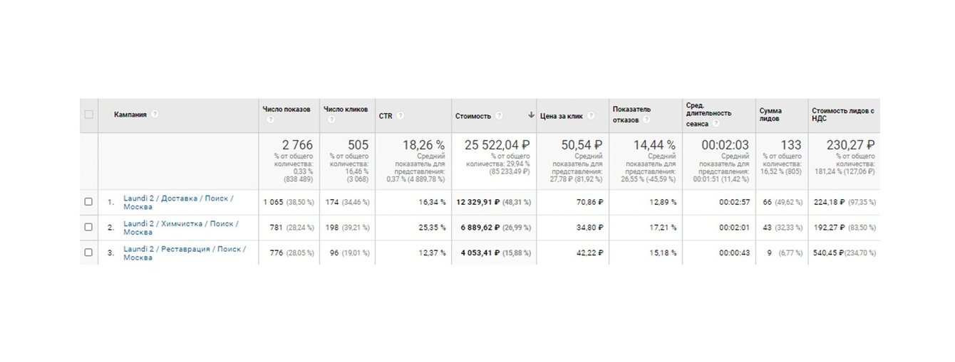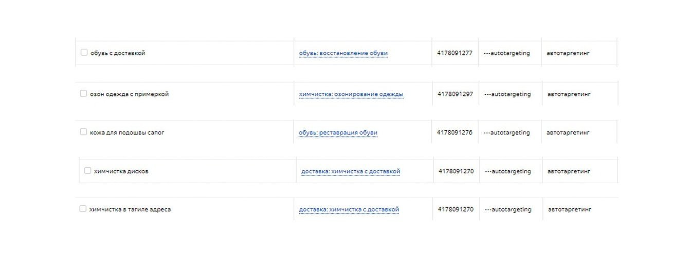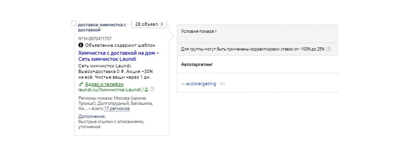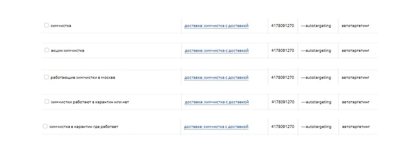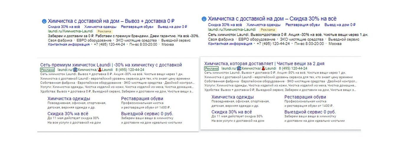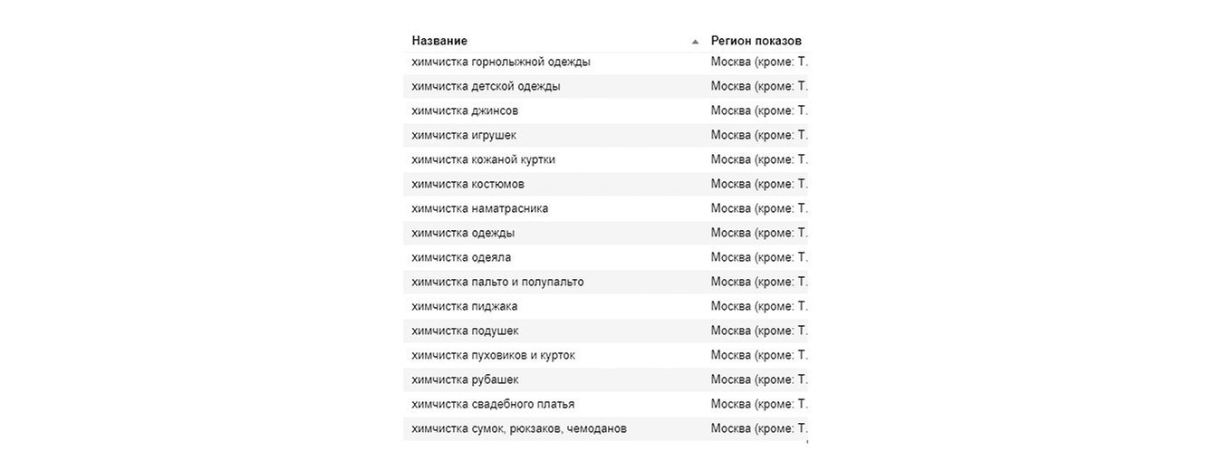 2. Следующим шагом стала настройка и запуск новых категорий запросов. Несмотря на наш печальный опыт с высокочастотными ключами (дорого и не конвертят), закрытие химчисток в Москве должно было положительно сказаться на аукционе, чем мы и решили воспользоваться. Семантику разделили по группам и пустили на соответствующие посадочные, которые сделали специально под контекст.