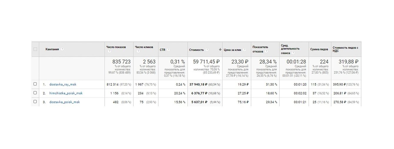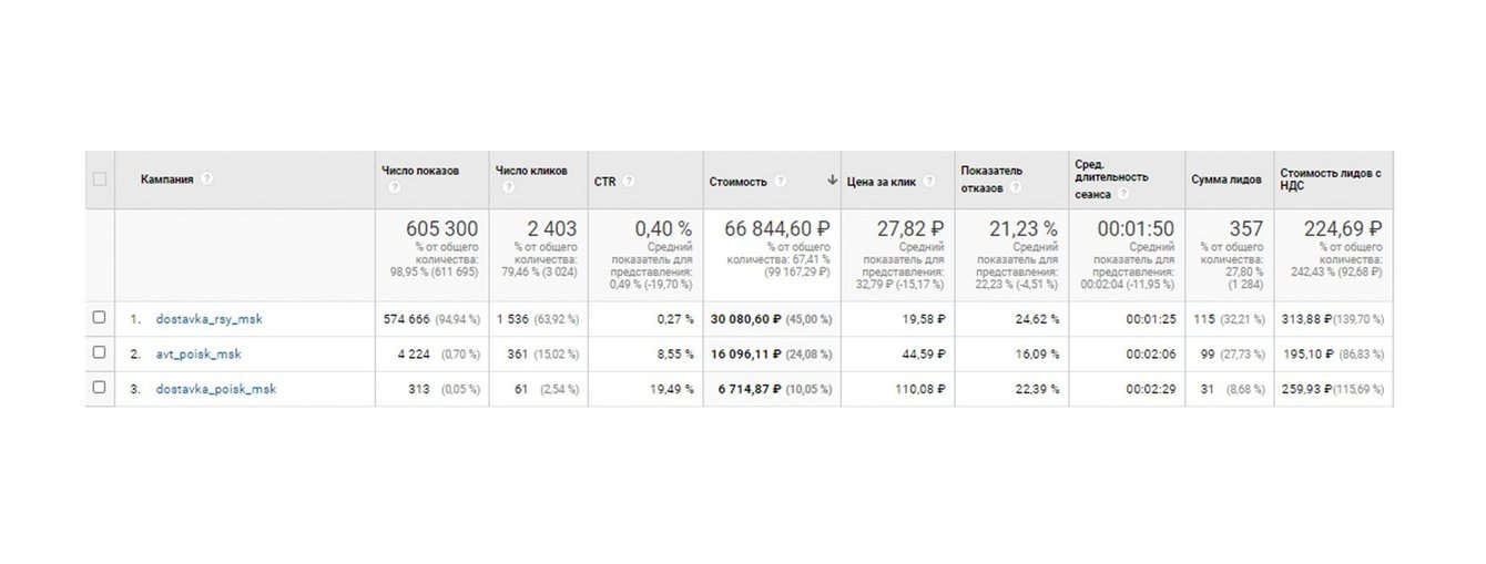 В Google.Реклама на доставку пришлось 49,62 %, а доля лидов с общих запросов составила 32,33 %.