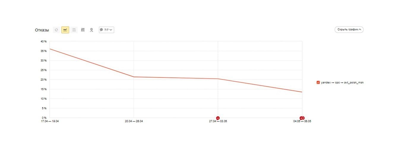 Спустя несколько недель работы с запросами долю нецелевых запросов удалось сократить до минимума. Отказы по кампании стабильно снижались: