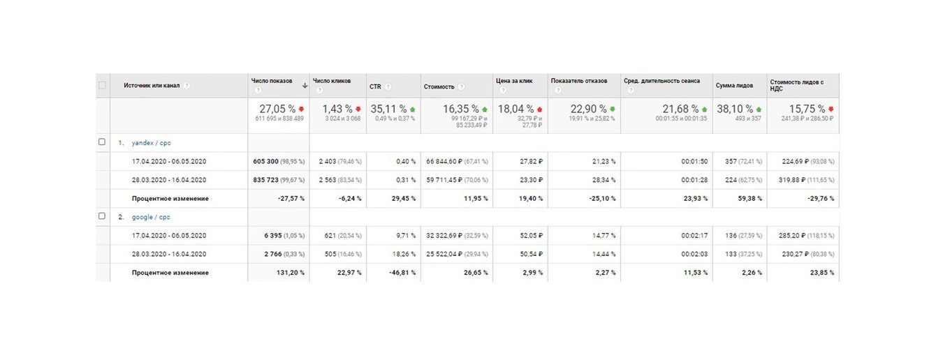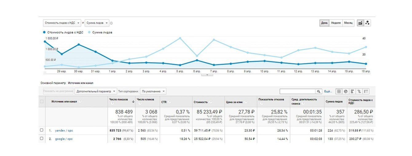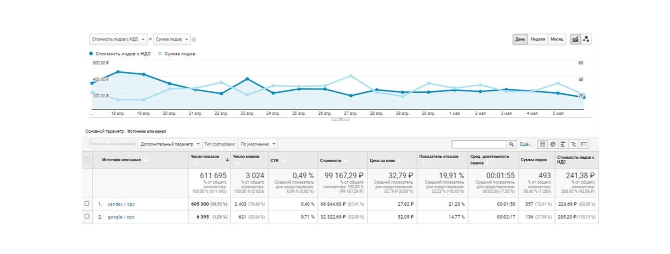 Первые результаты стали заметны уже в начале апреля, а к середине месяца мы вышли на колоссальный рост. В сравнении с предыдущим периодом количество лидов увеличилось на 236 %, а их стоимость снизилась на 62,8 % и составила 286,5 руб. за лид.