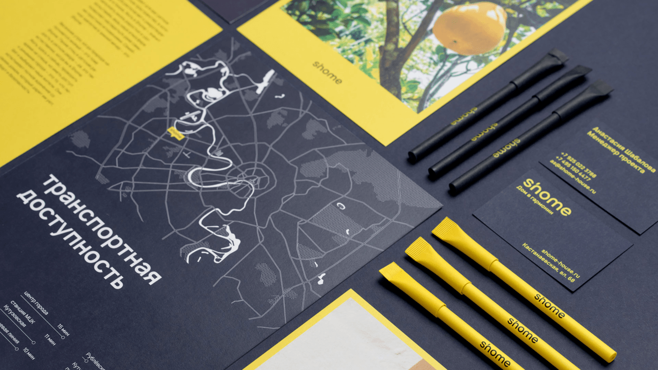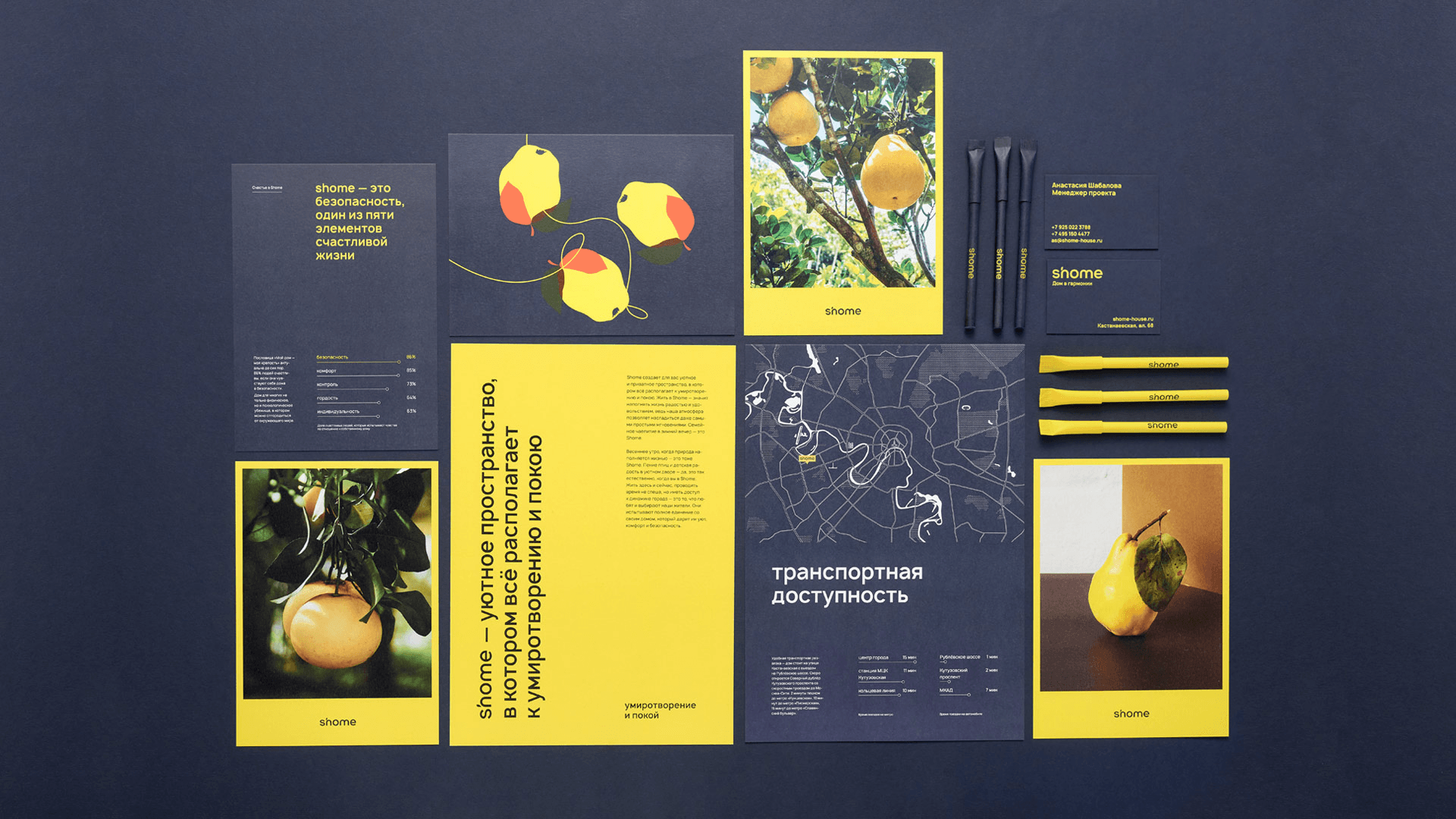 Суммируя все данные, полученные в ходе исследований, креативный отдел SH решил взять за основу фирменного стиля лимонный цвет, который ассоциируется с чувством счастья и благополучия. Черная палитра выгодно оттеняет его на контрасте и создает ощущение приватного благополучия семьи, которое так важно для целевой аудитории.
