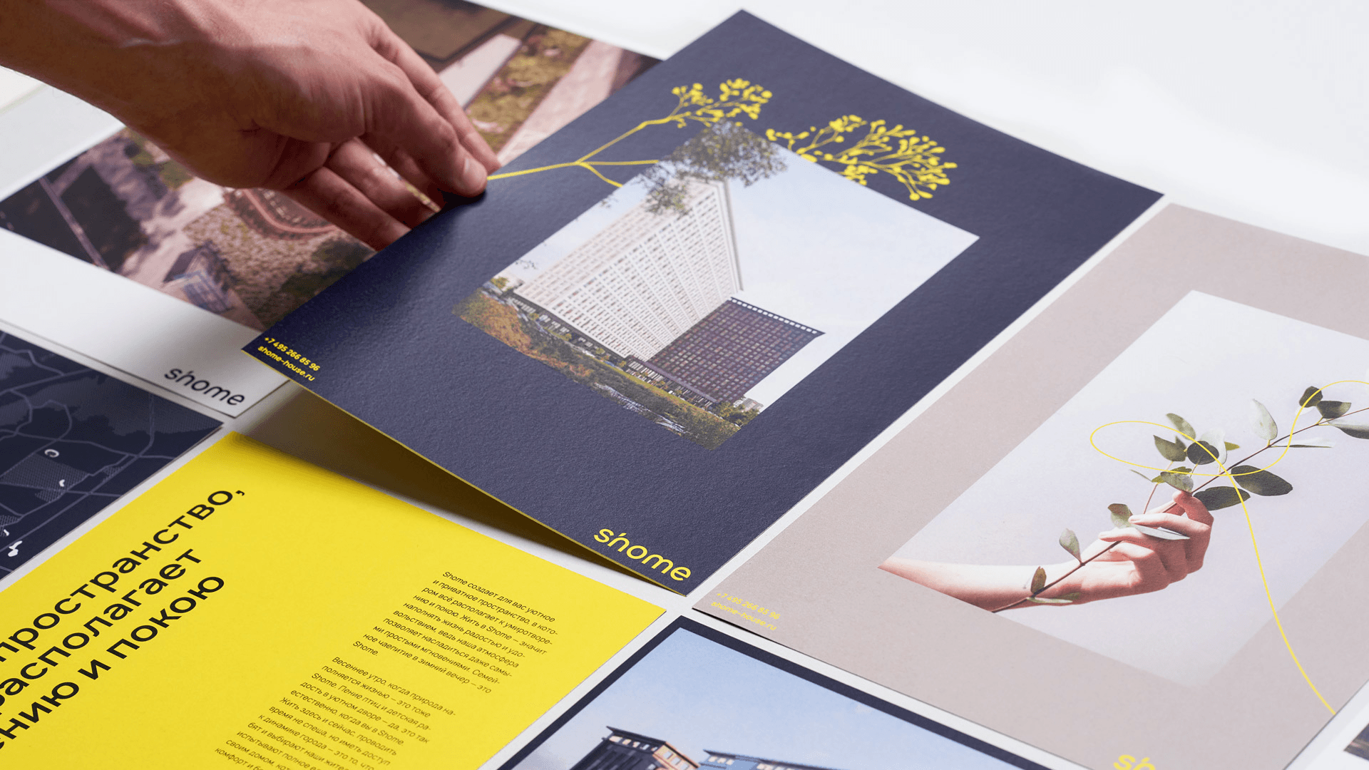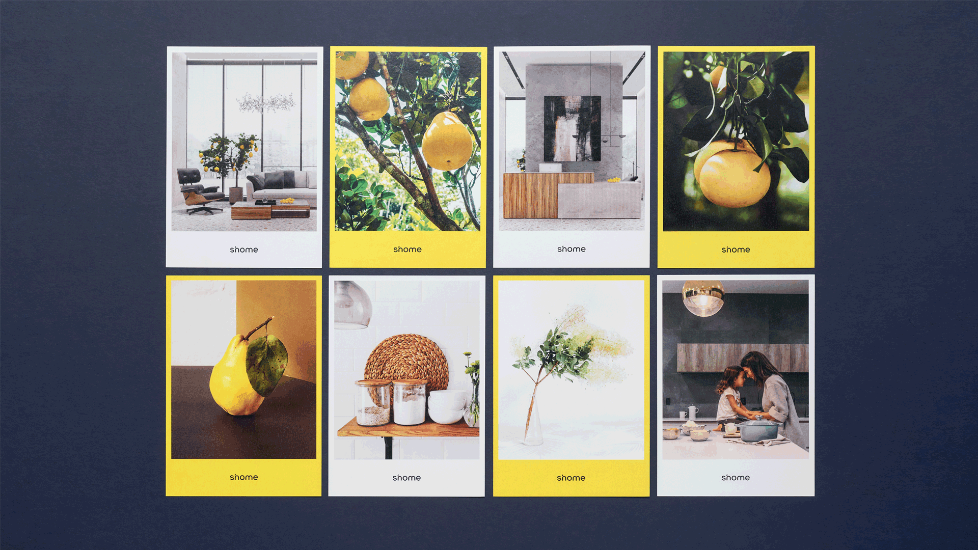 Для команды было важно создать нейм проекта, который вызывал бы у клиента ассоциативный ряд с домашним уютом и спокойствием, природой и тишиной, которые передаются на фонетическом уровне взаимодействуя со словом «home». При этом простота и емкость названия не должны были лишать его оригинальности и определенной изысканности, отсюда и появилось имя проекта — Shome. Генеральный слоган проекта — «Дом в гармонии» создает комплексное ощущение уюта и спокойствии в коммуникации с брендом.