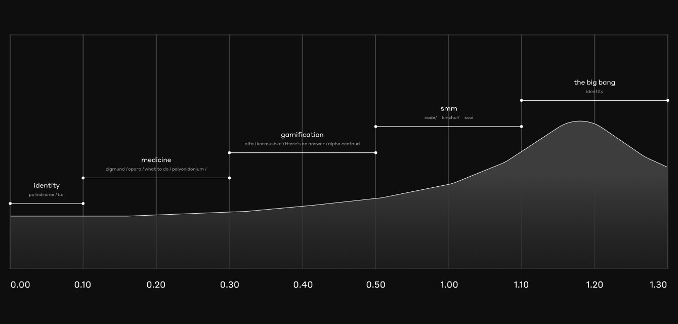 Мы использовали классическую, трёхактную, драматургическую структуру, дополнив её цветовым кодированием. Отличительная черта — отсутствие традиционного спада напряжения в конце, так как здесь нет развязки. Сценарий призван отразить архетип «Палиндрома»: мы новаторы и бунтари.