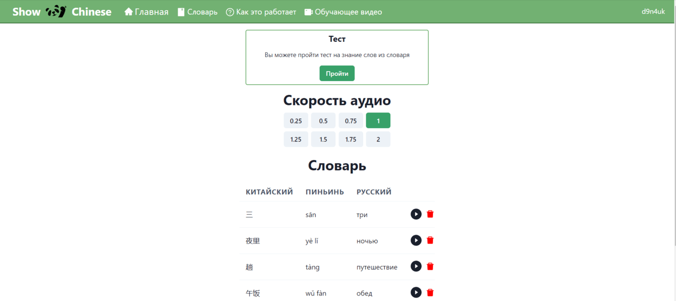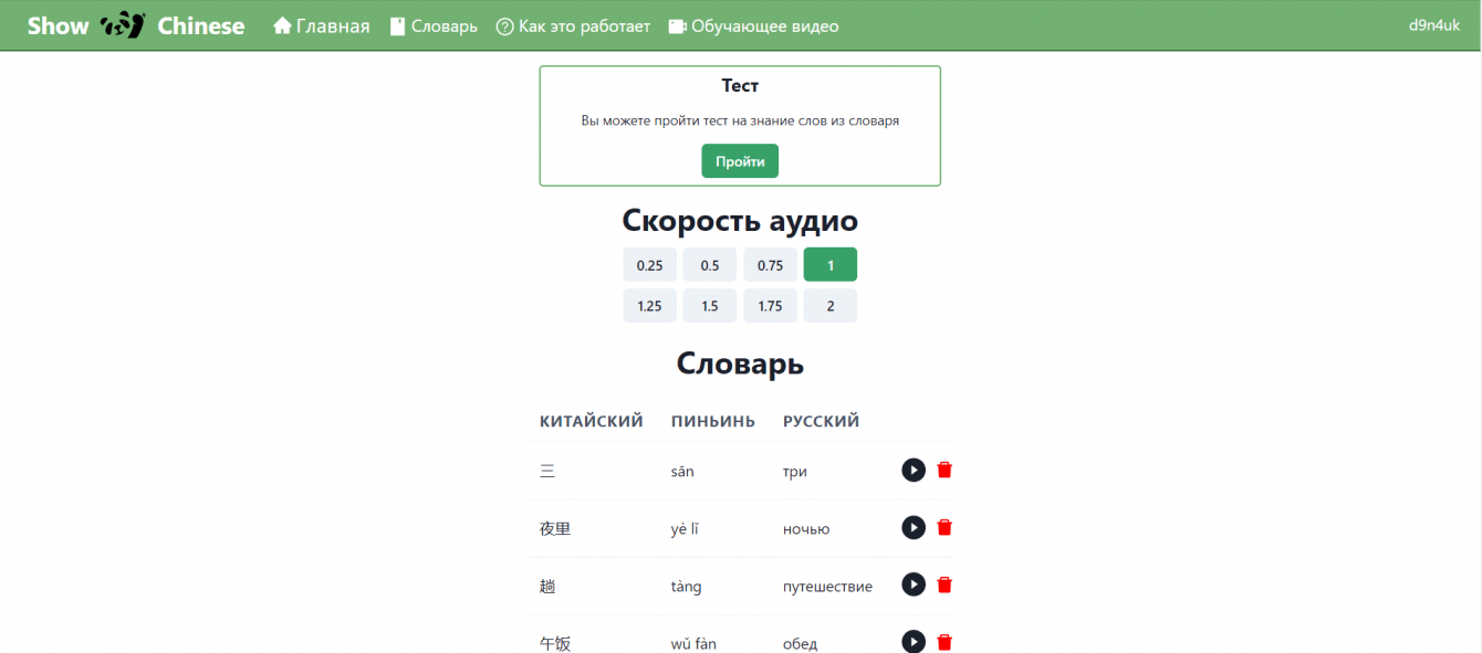 Для плодотворного изучения китайского необходимо практиковаться, поэтому был реализован раздел словаря с возможность тренировки. В словарь слова добавляются если нажать на иероглиф при просмотре фильма, в словаре показывается его транскрипция(пиньинь), перевод на русский язык, а также возможность прослушать это слово на китайском.
