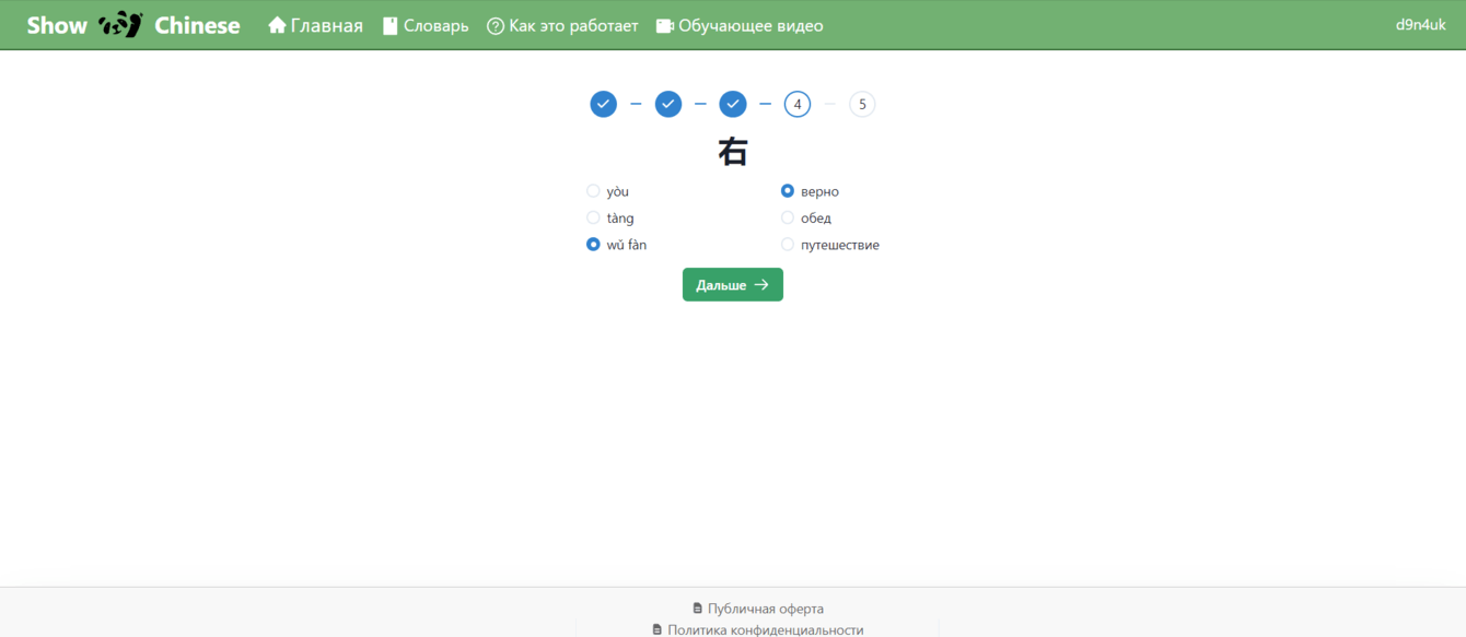 Изучив все слова в словаре - можно потренироваться, сайт показывает иероглиф - Вам необходимо указать его транскрипцию и перевод на русском, в конце появится информация о правильности Вашего выбора.