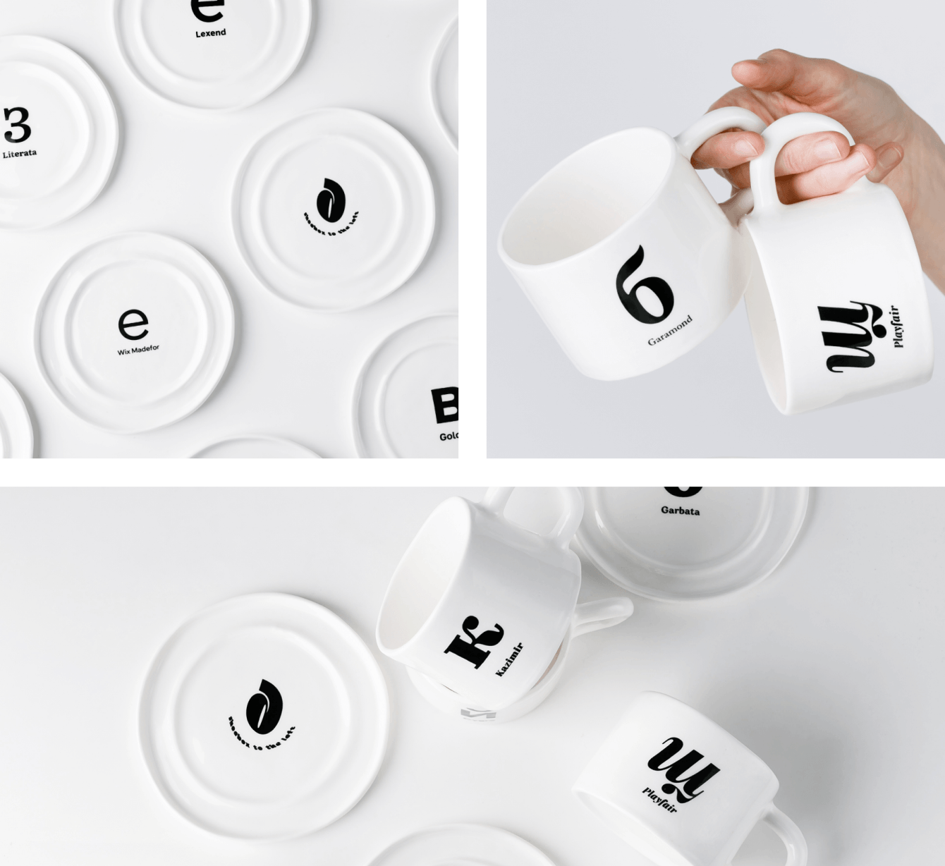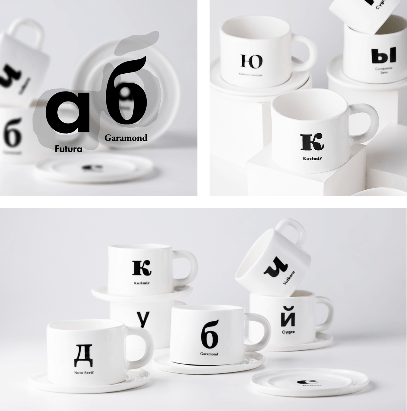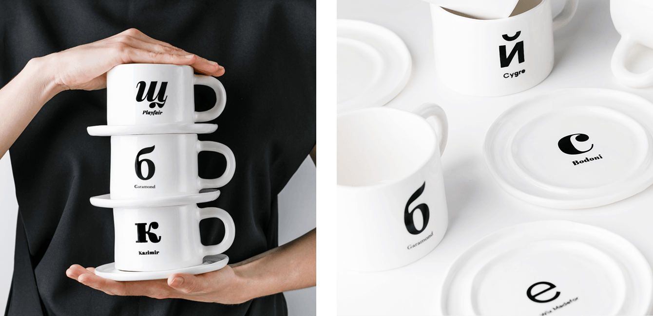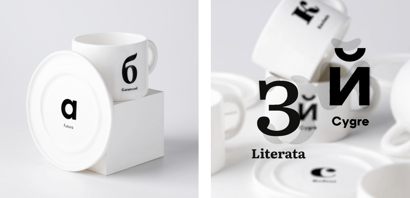 Так у нас родилась «шрифтовая пара» — дизайнерский мерч, в котором сошлись типографика и керамика. Мы взяли классическую чайную пару — чашку и блюдце — и наделили её новым смыслом. На каждую чашку и на каждое блюдце мы нанесли по одной букве. Вместе они — шрифтовая пара: два разных шрифта, которые звучат в одном тандеме.