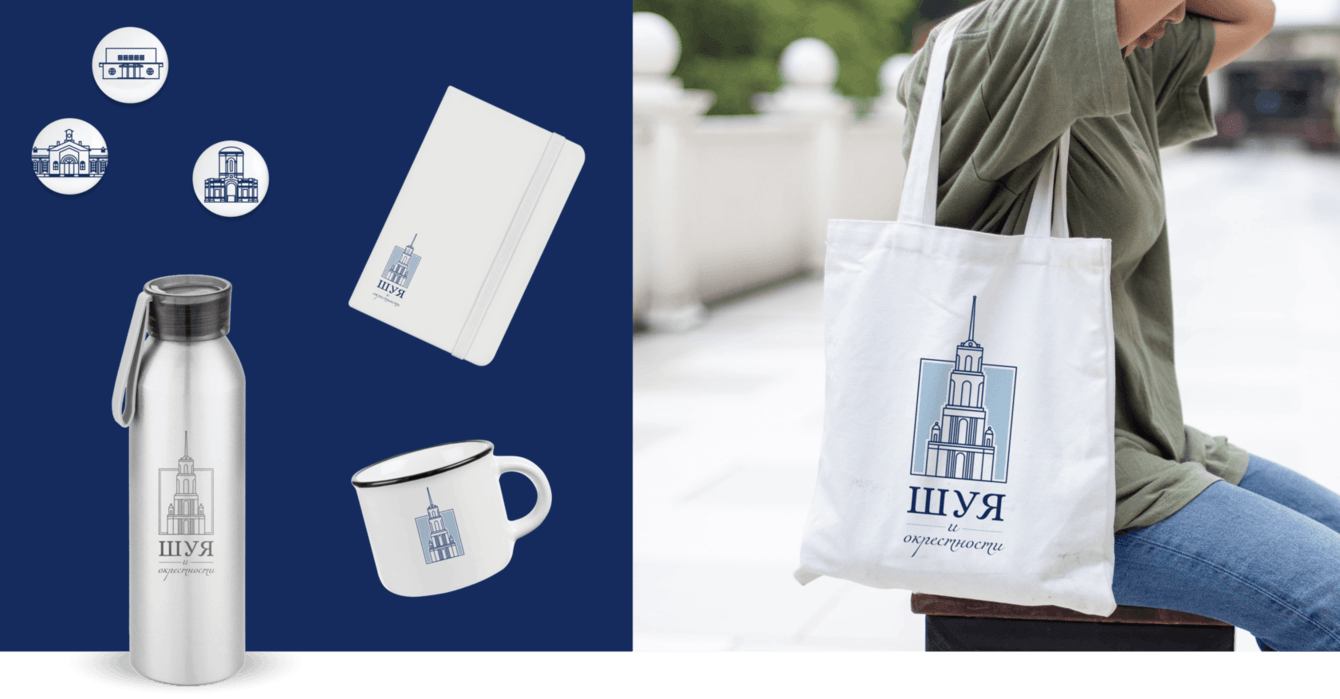 За основу мы взяли простую графику, классические шрифты и цветовую гамму, с которой Шуя ассоциируется у респондентов. В качестве знака выступает Колокольня Воскресенского собора — архитектурная доминанта и символ города. Сочетание шрифтов — крупного заголовка и курсива — вызывает ассоциации с заметками на полях в путевом журнале.