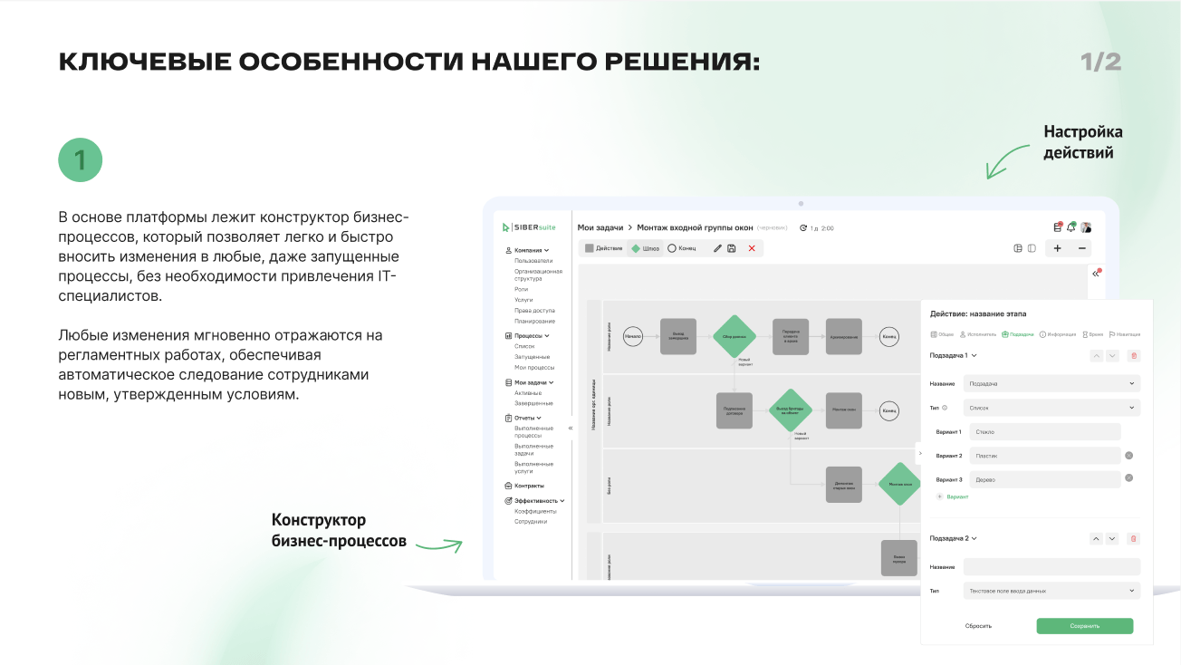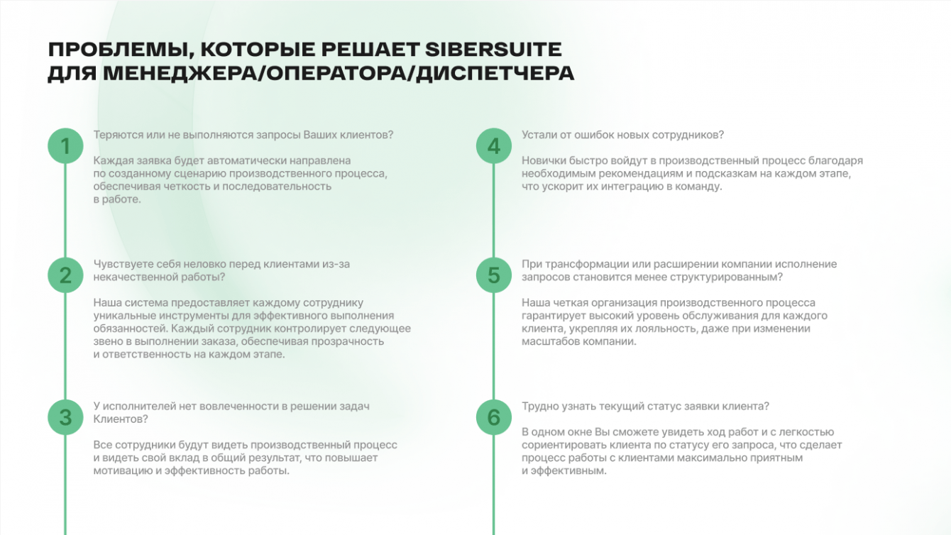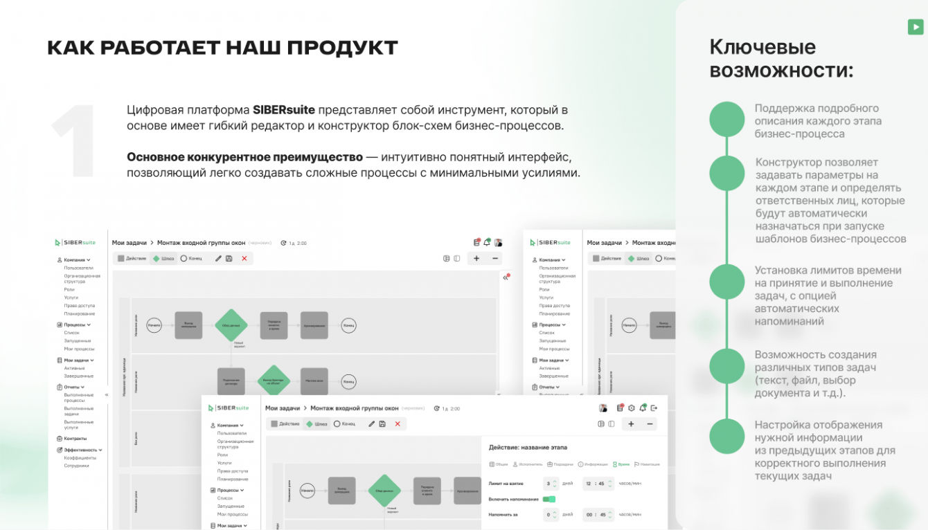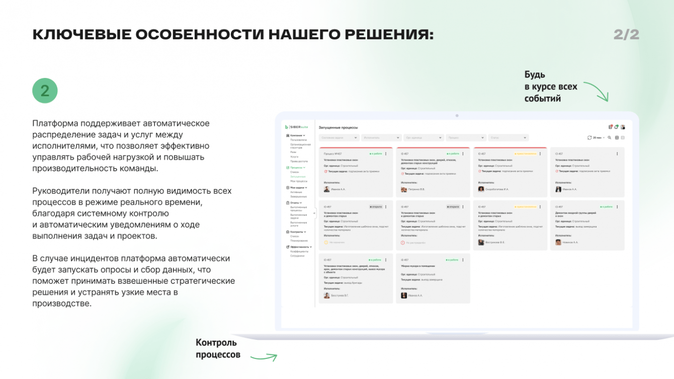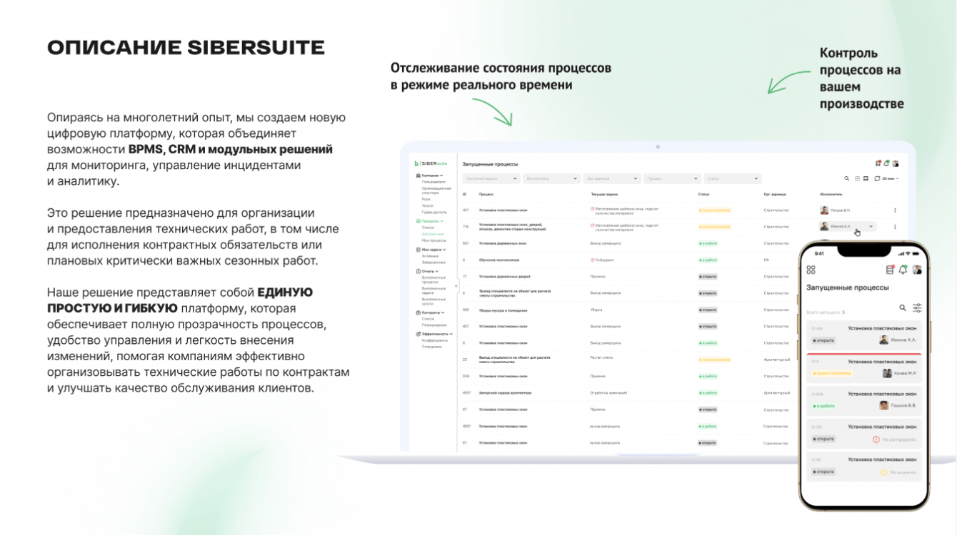 Наша платформа Sibersuite объединяет самые востребованные пользовательские функциональности таких систем как: CRM, BPMS, ERP, Help Desk, таск-трекеров и аналитических платформ в единое простое и гибкое решение. Наше решение помогает автоматизировать процессы для управления и организации работ, системно распределяет нагрузку на исполнителей, контролирует и информирует о ходе производства 24/7, и позволяет вносить изменения в уже запущенные процессы без привлечения IT-специалистов. Освободите свое время от непрофильных задач! Наша система автоматизирует все процессы, связанные с вашими сотрудниками, позволяя вам сосредоточиться на своих основных задачах. Ключевая особенность нашего продукта это простота в работе и интуитивно понятный пользовательский интерфейс.