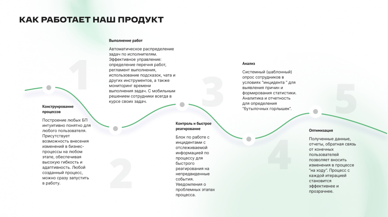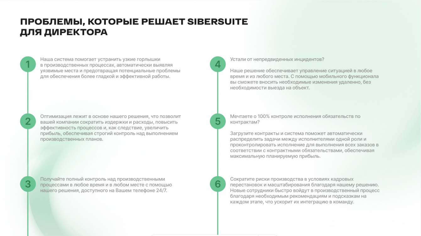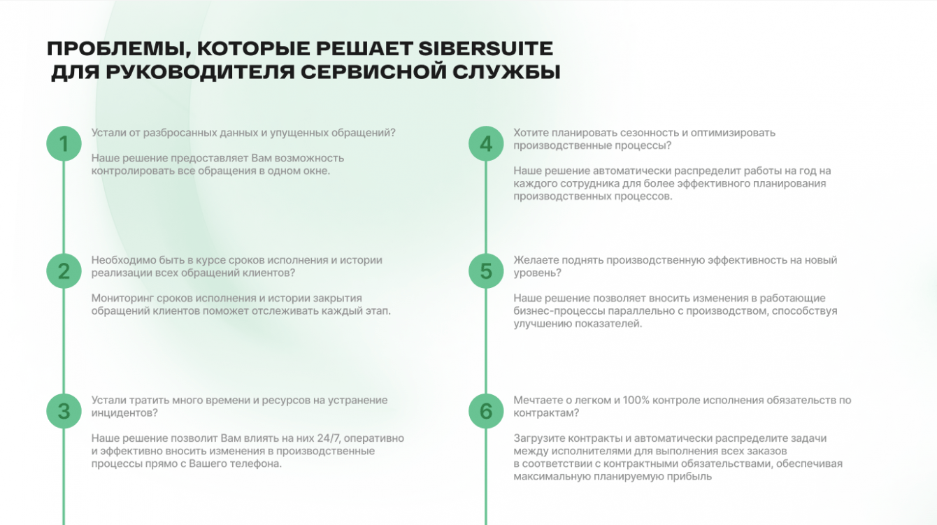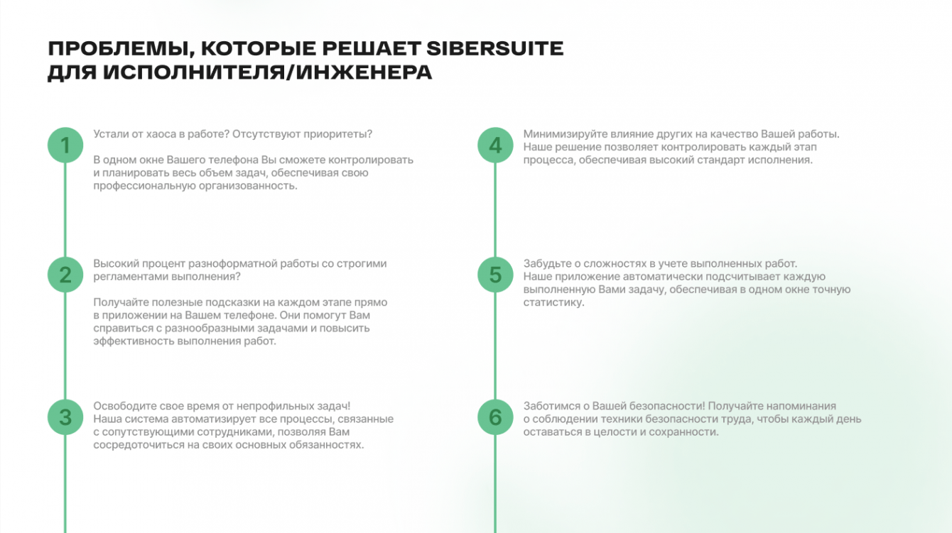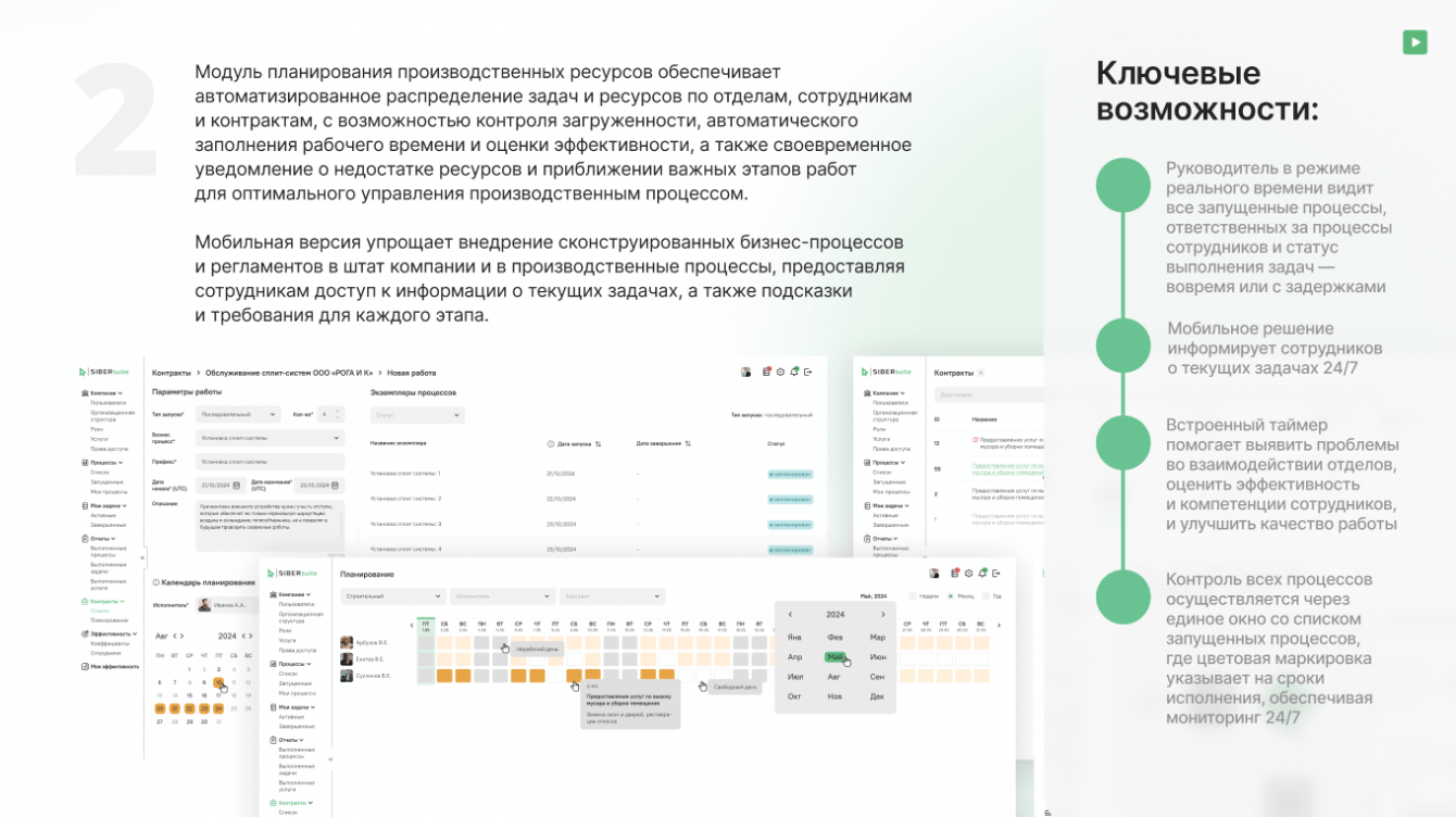 Наша платформа Sibersuite объединяет самые востребованные пользовательские функциональности таких систем как: CRM, BPMS, ERP, Help Desk, таск-трекеров и аналитических платформ в единое простое и гибкое решение. Наше решение помогает автоматизировать процессы для управления и организации работ, системно распределяет нагрузку на исполнителей, контролирует и информирует о ходе производства 24/7, и позволяет вносить изменения в уже запущенные процессы без привлечения IT-специалистов. Освободите свое время от непрофильных задач! Наша система автоматизирует все процессы, связанные с вашими сотрудниками, позволяя вам сосредоточиться на своих основных задачах. Ключевая особенность нашего продукта это простота в работе и интуитивно понятный пользовательский интерфейс.