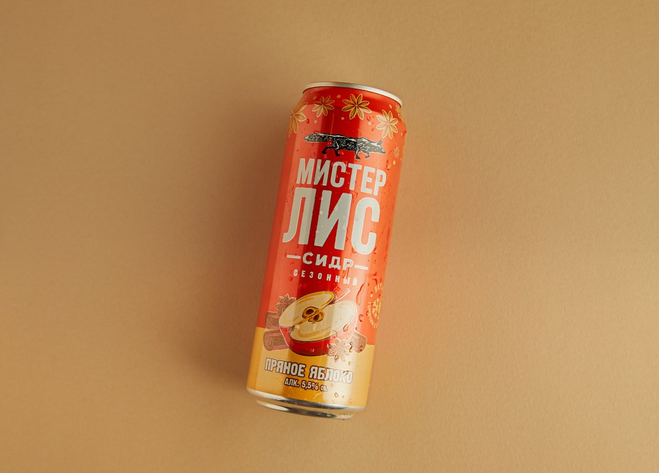 Дизайн основной продукции “Мистера Лиса” дифференцируется по вкусам: единый бежевый цвет банки с изображением груши, яблока или ягод в нижней части этикетки. Для нового сезонного сидра необходимо было придумать что-то отличительное, но остающееся в общей стилистике.