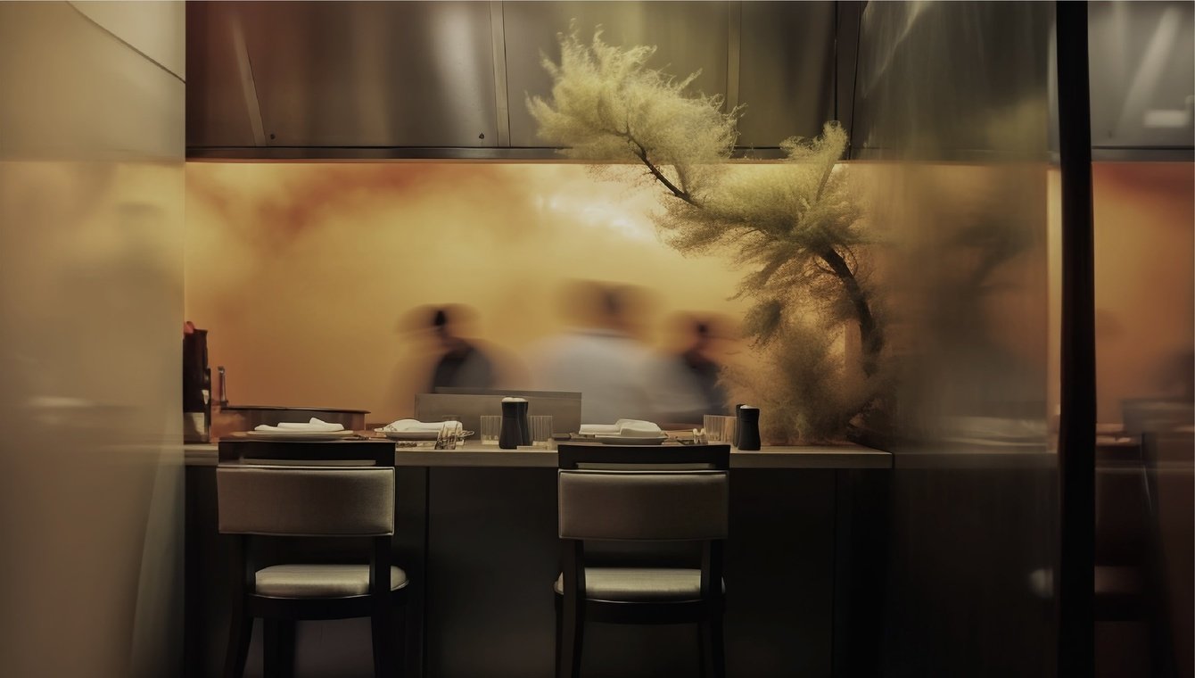 Обтекаемые иллюстрации причудливых форм, в которых можно рассмотреть движения шефа, похожие на танец, и его гостей, которыми могут быть как реальные люди, так и таинственные японские духи. Иллюстрации создают целый мир, в который гостю интересно погружаться.