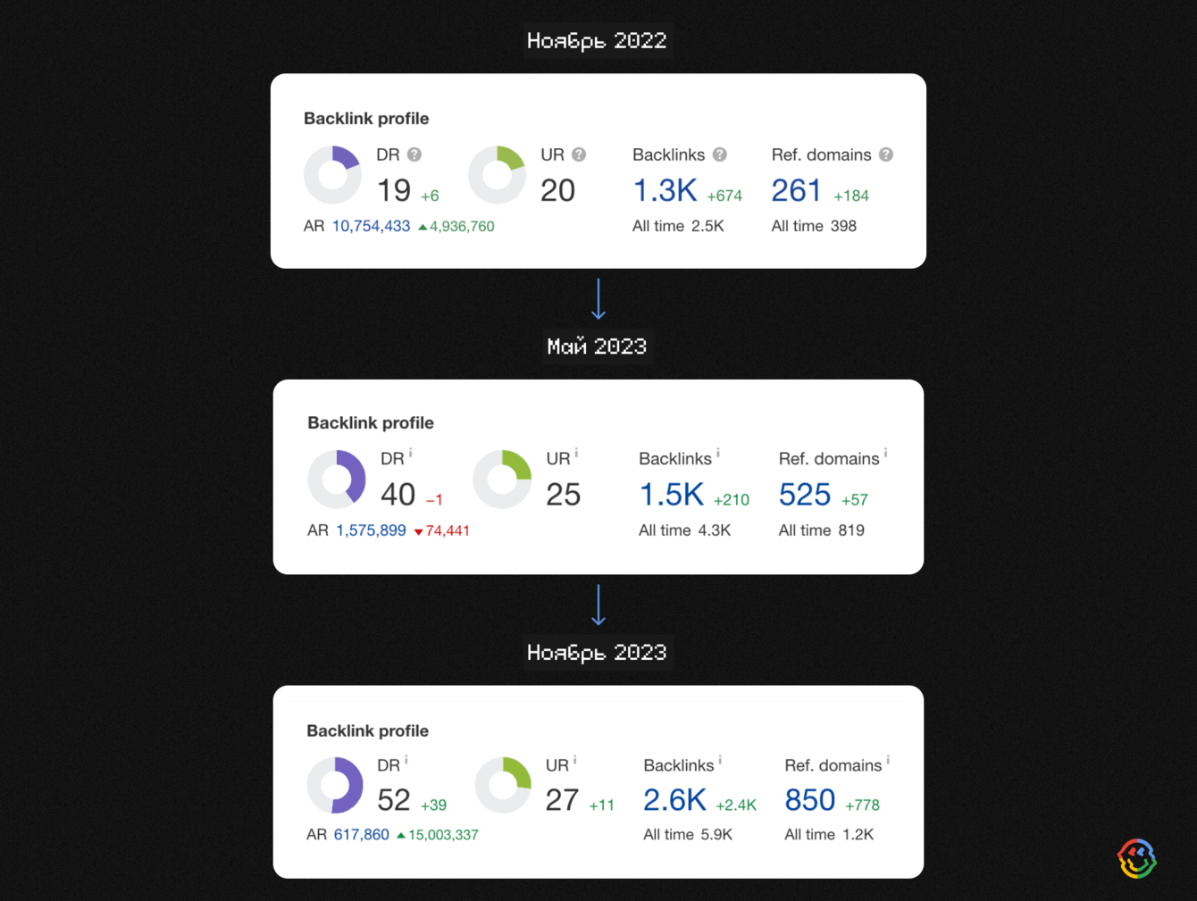 • Количество качественных бэклинков выросло с 1300 до 2600.