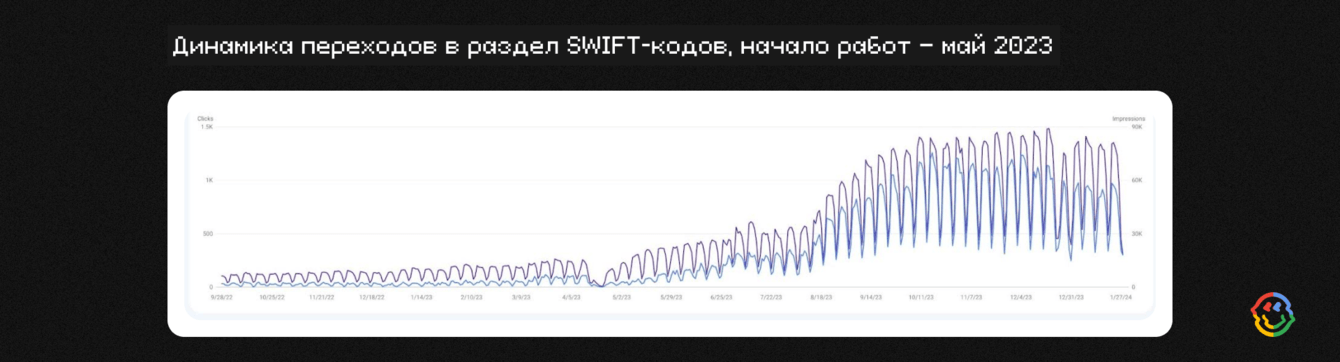 Тем, что мы добавили общую и индивидуальные страницы банков, мы охватили больше семантики. Это целые кластеры высокочастотных запросов, например «uk swift codes» или «bank of cyprus swift code». А еще заложили базу нашей стратегии: больше страниц — лучше.