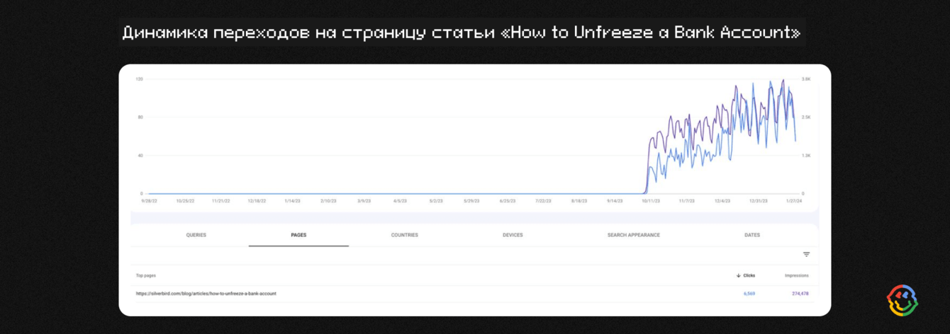 Результаты получились отличные. Например, статья «How to Unfreeze a Bank Account» принесла 6 570 переходов за четыре месяца.