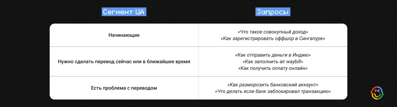 Почему именно эти сегменты ЦА? Из-за конкурентов. В нише транснациональных переводов ЛПР — или сам предприниматель, или, что чаще, его бухгалтер, который находит подходящий сервис и оформляет переводы. Те, кто уже не раз делали переводы, редко ищут нового посредника. Они сразу идут к тем, с кем уже работали и чьими услугами довольны. Нам нужно было «ловить» их еще до принятия решения.