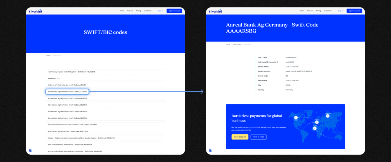 В случае Siverbird PLG-страницами стали страницы со SWIFT-кодами для переводов. Почему? Во-первых, команда клиента уже начала разрабатывать и внедрять SWIFT-страницы. Во-вторых, мы сравнили потенциальный трафик, который мог принести раздел, с тем, сколько ресурсов нужно потратить на оптимизацию существующих и запуск новых страниц. И поняли: надо брать.