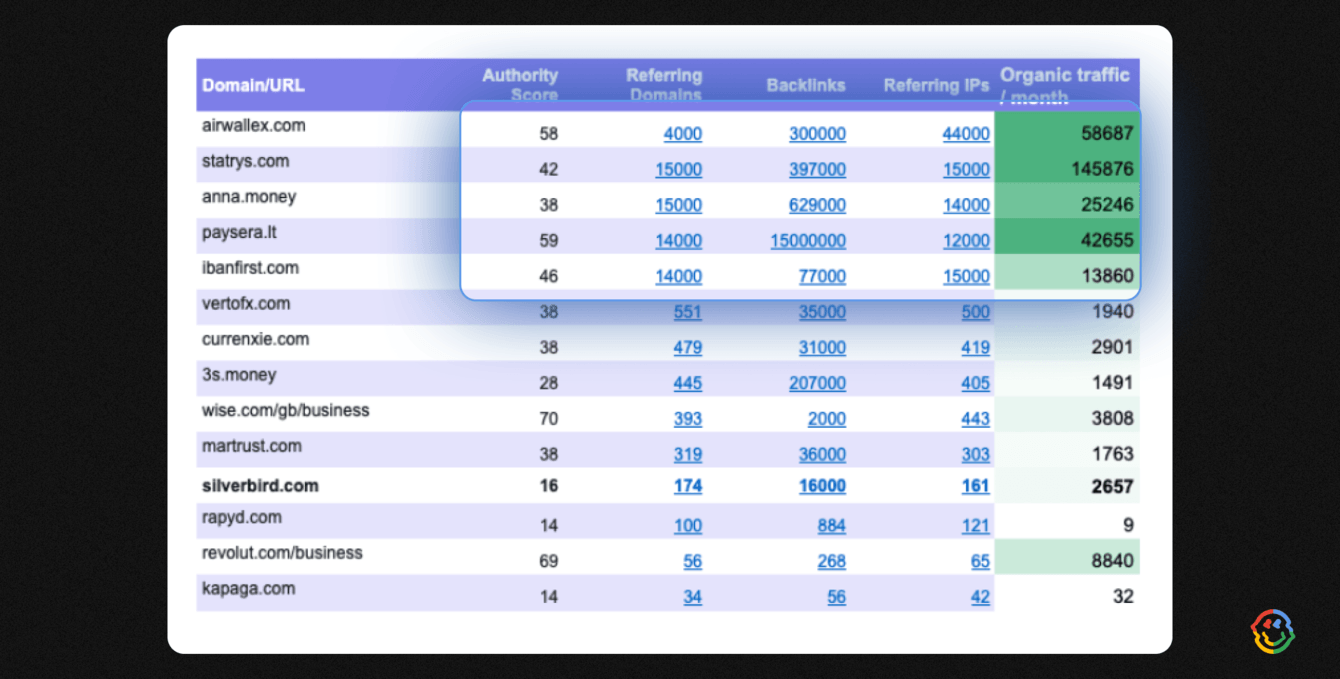 • Выбирали подходящие площадки и EDU-сайты для размещения. Критерии выбора: ежемесячный органический трафик, spam score и DR площадки, который должен был превышать DR Silverbird.