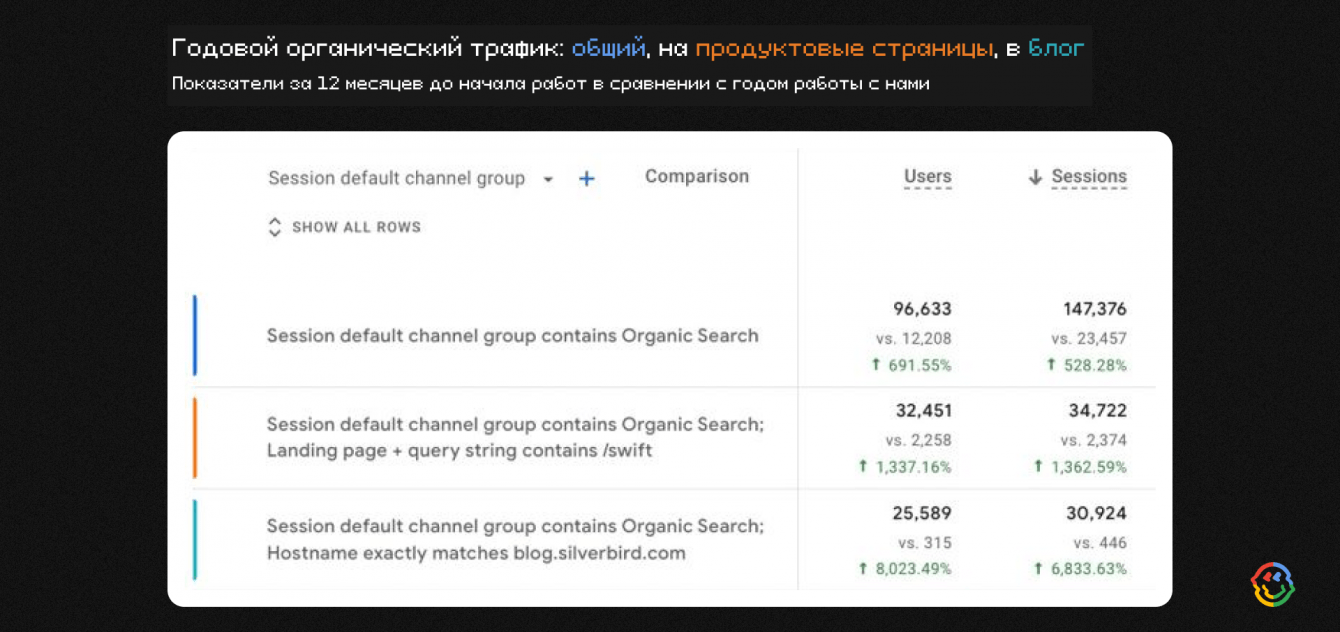 • Годовые показатели органического трафика до начала работ в сравнении с годом работы с нами выросли: