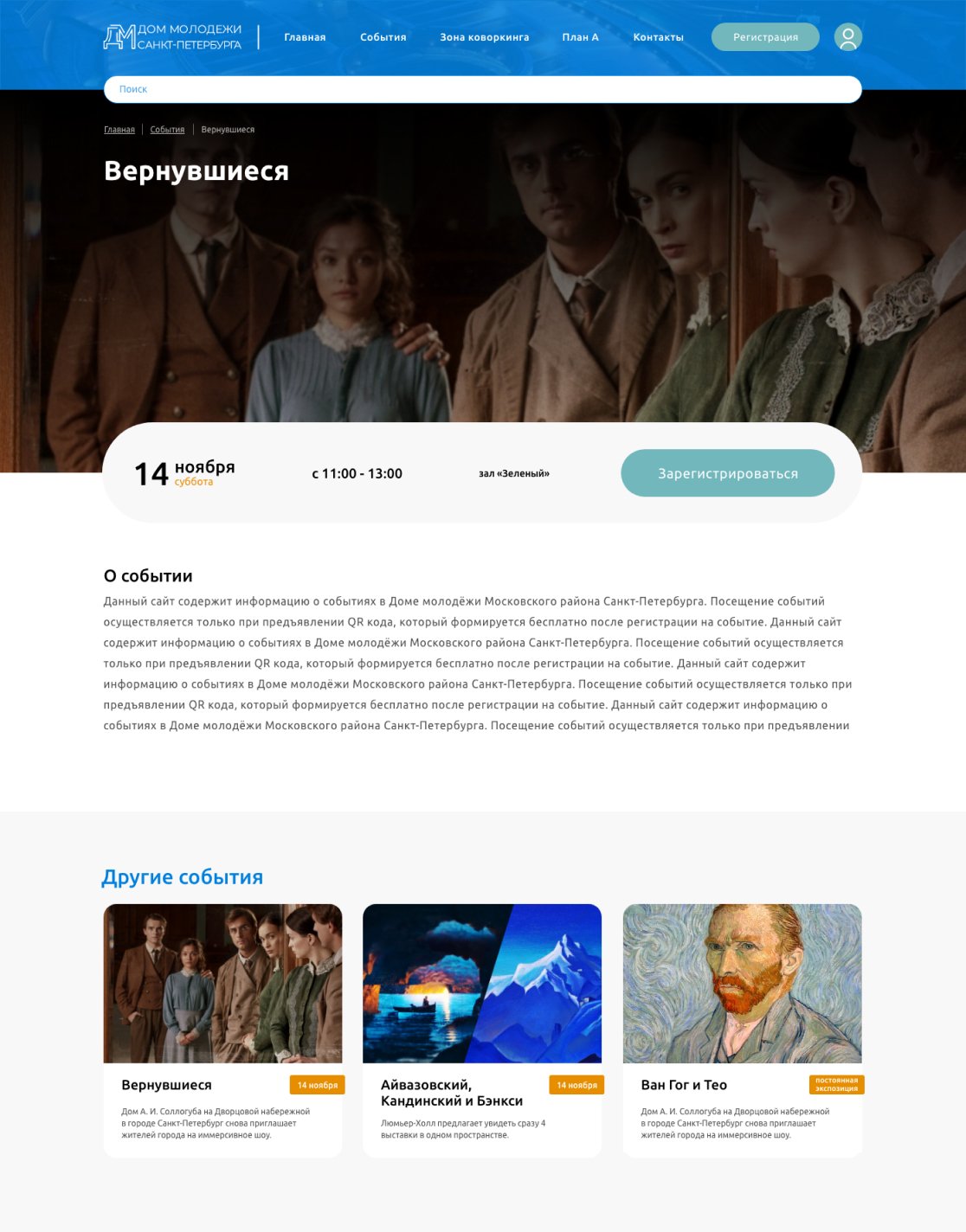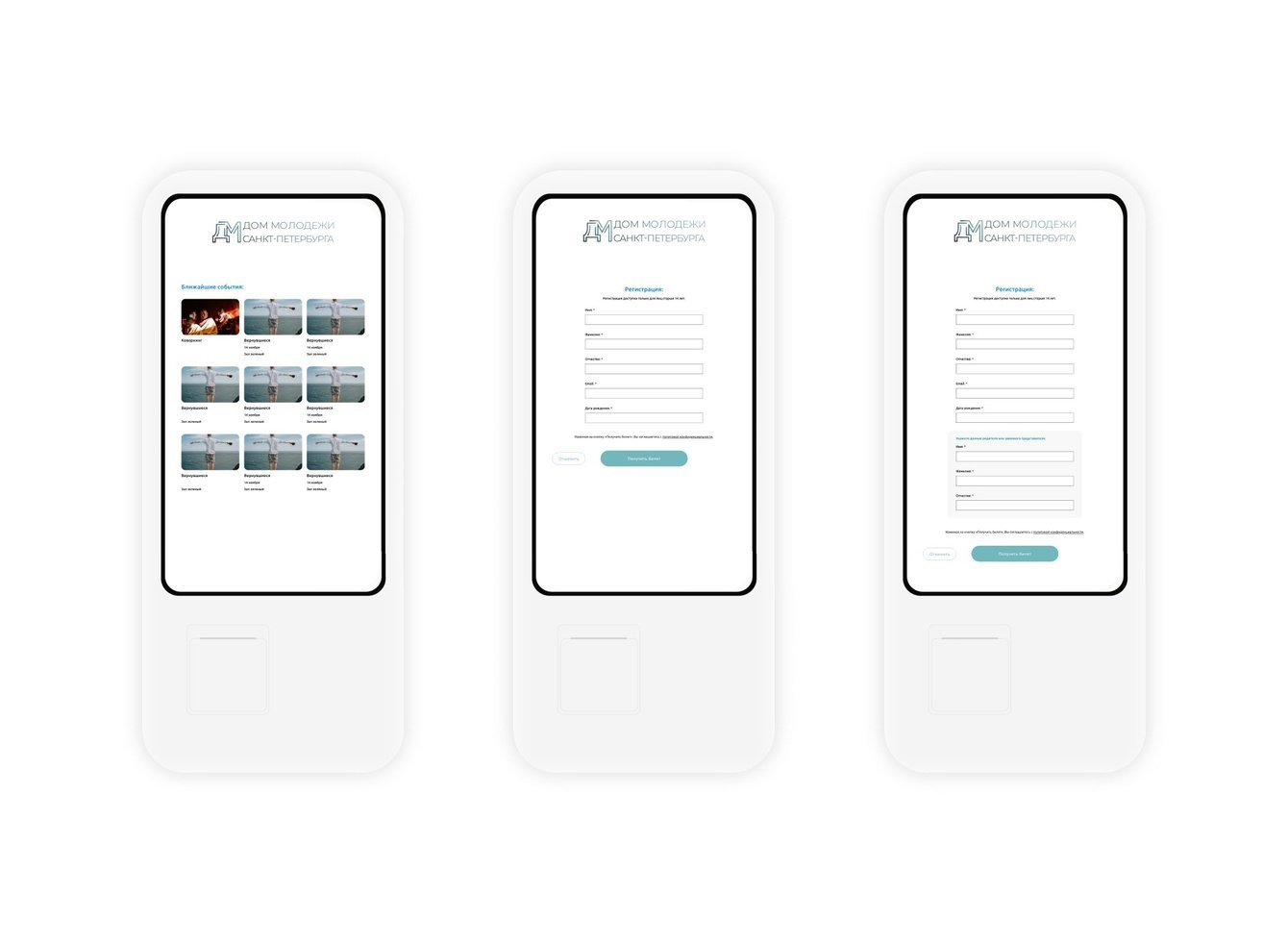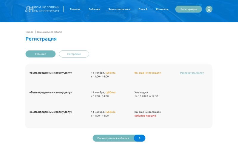 С нуля был разработан процесс автоматизированной регистрации на мероприятия, формирования, хранения, печати и проверки билетов с помощью QR кодов. Для удобства посетителей реализованы как офлайн-регистрация через интерактивный киоск, так и онлайн-регистрация через сайт. Для администраторов Дома молодежи СПБ собираются данные пользователей сайта и интерактивных киосков для формирования статистики посещаемости.