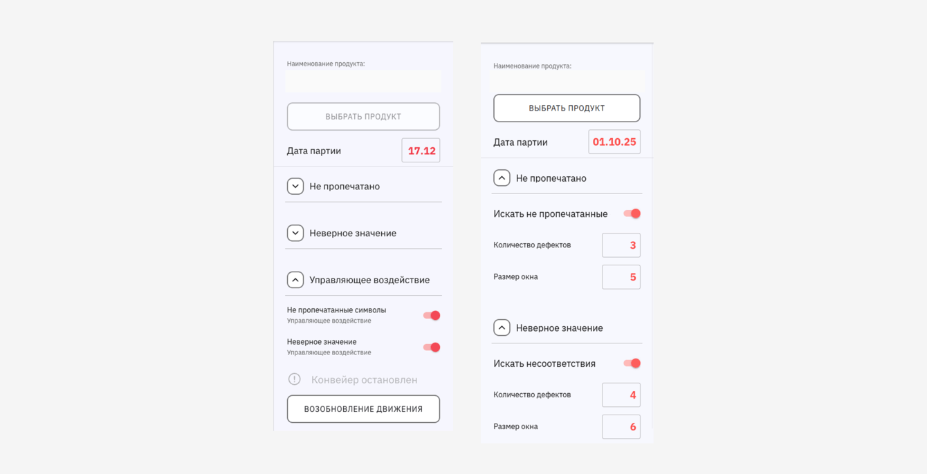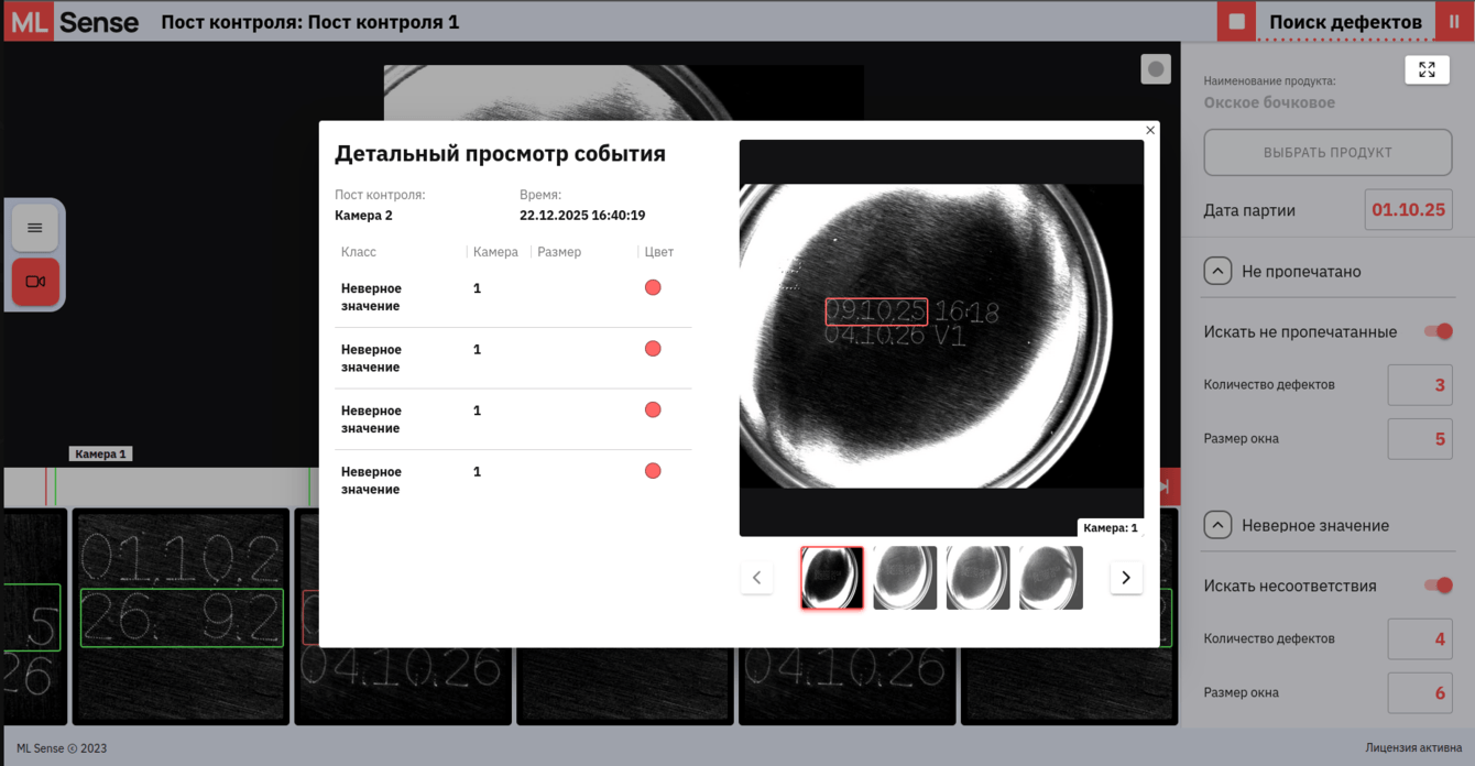 При обнаружении отклонения система формирует событие и подаёт сигнал на остановку линии. Оператор получает уведомление с указанием причины: отсутствие даты, нечитаемая печать или несоответствие параметрам партии.