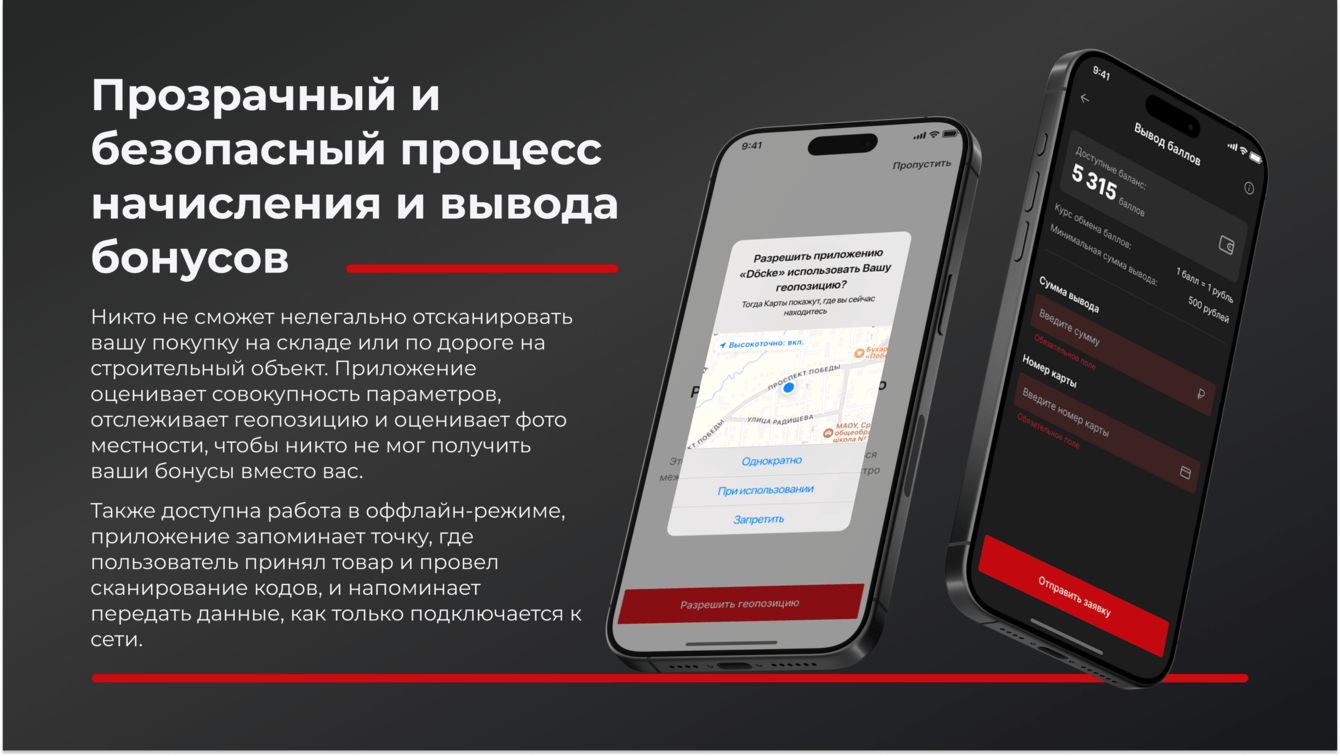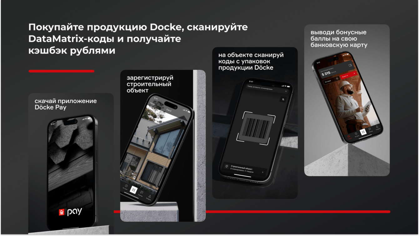 Когда товар приезжает на строительный объект, пользователь фотографирует его и сканирует DataMatrix-коды. Менеджер Docke в админ-панели проверяет, что товар находится на объекте и все совпадает — например, на фото пять палетов черепицы и отсканировано пять палетов черепицы, и начисляет бонусные баллы.