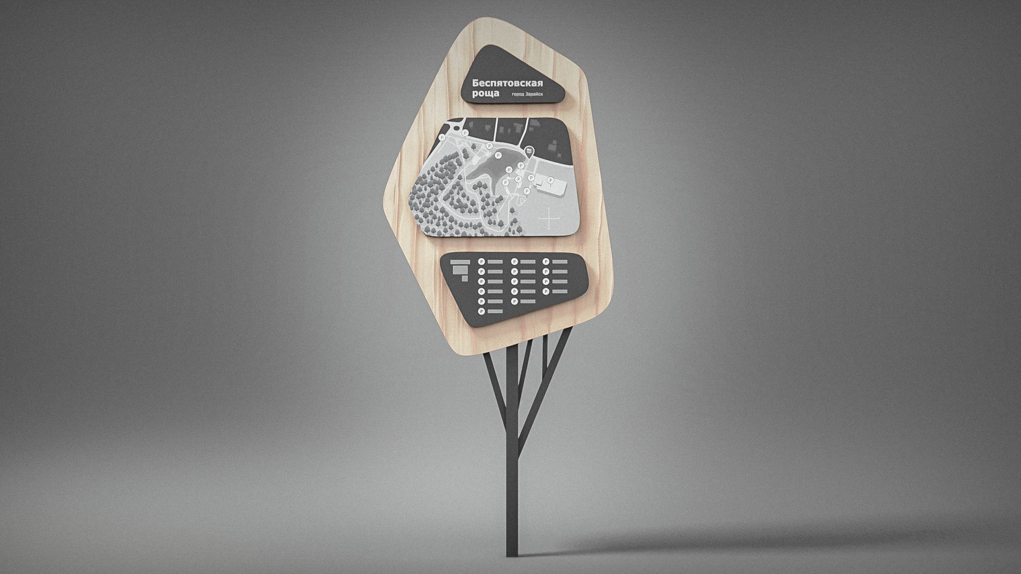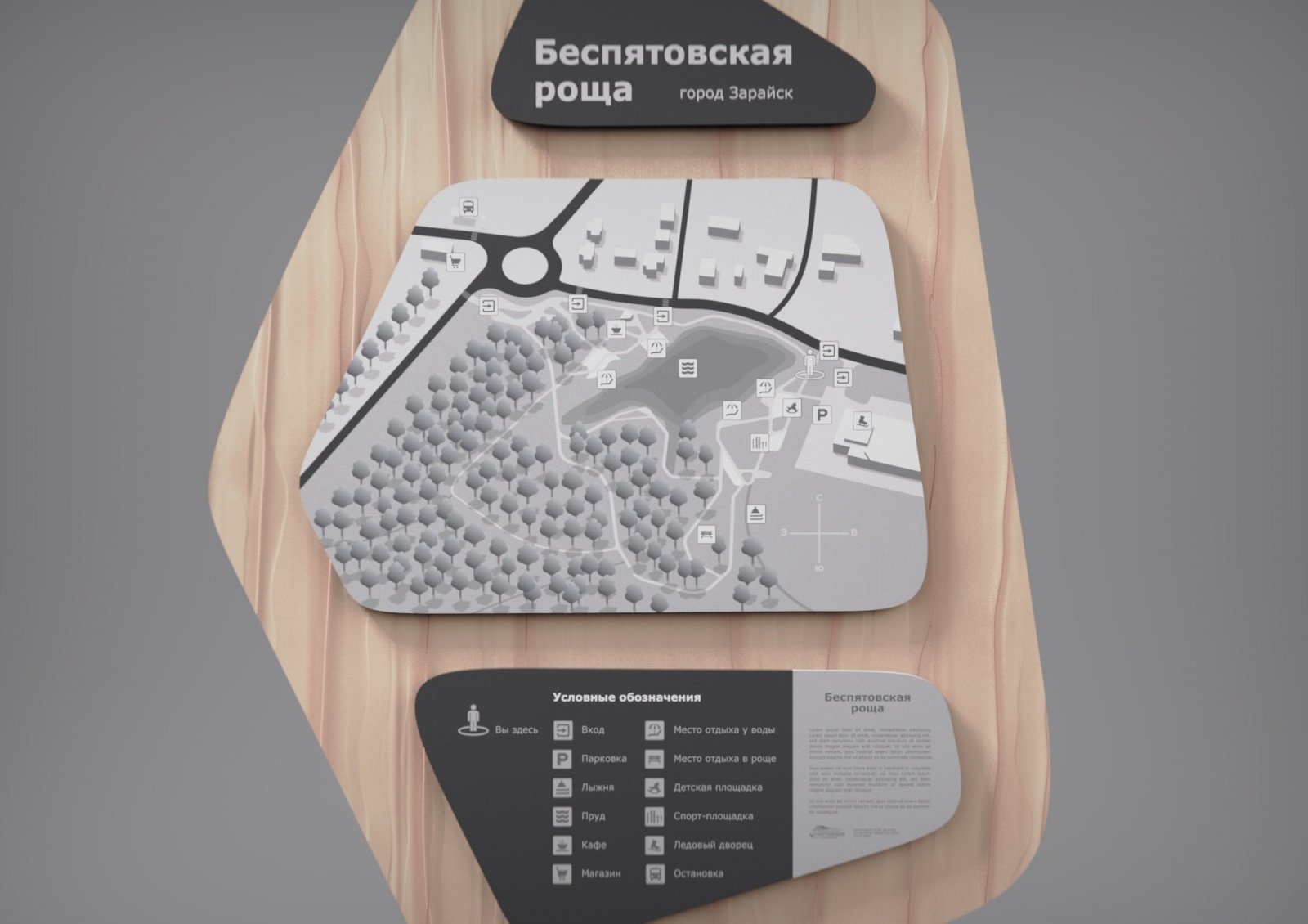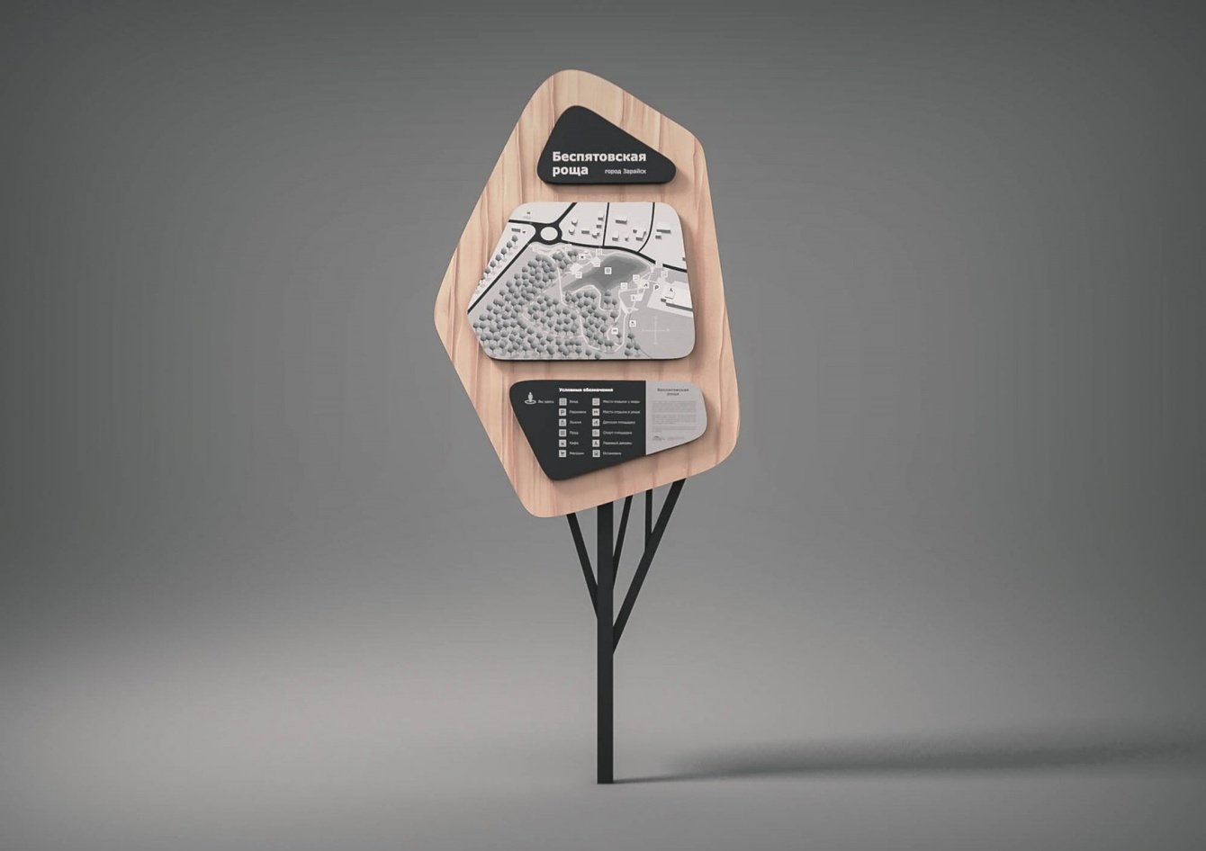 Нам была поставлена задача: разработать ахроматическое решение для карты Беспятовской рощи. В установленные размеры стеллы необходимо поместить границы рощи и все важные элементы для ориентации в пространстве.