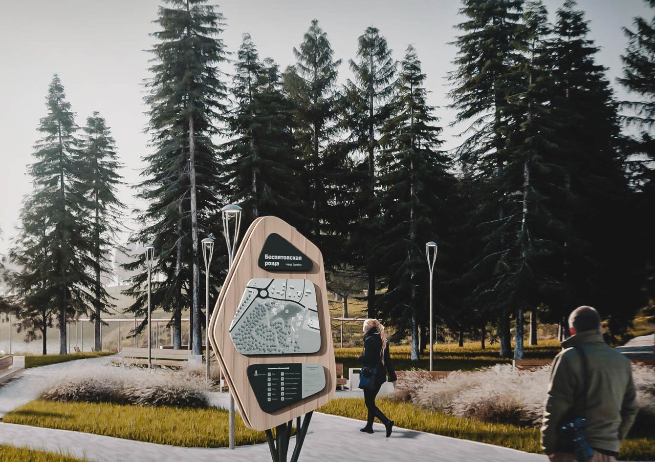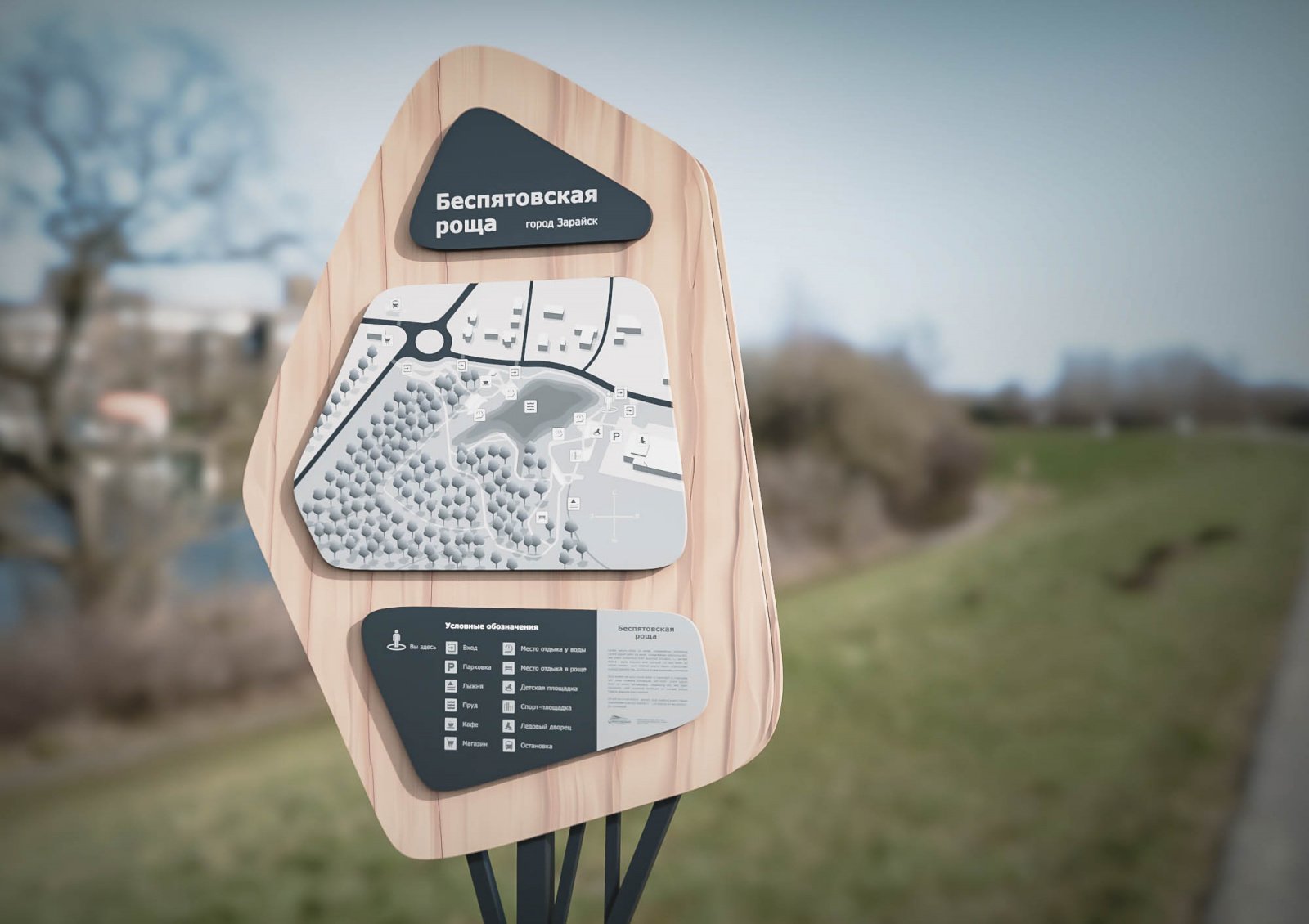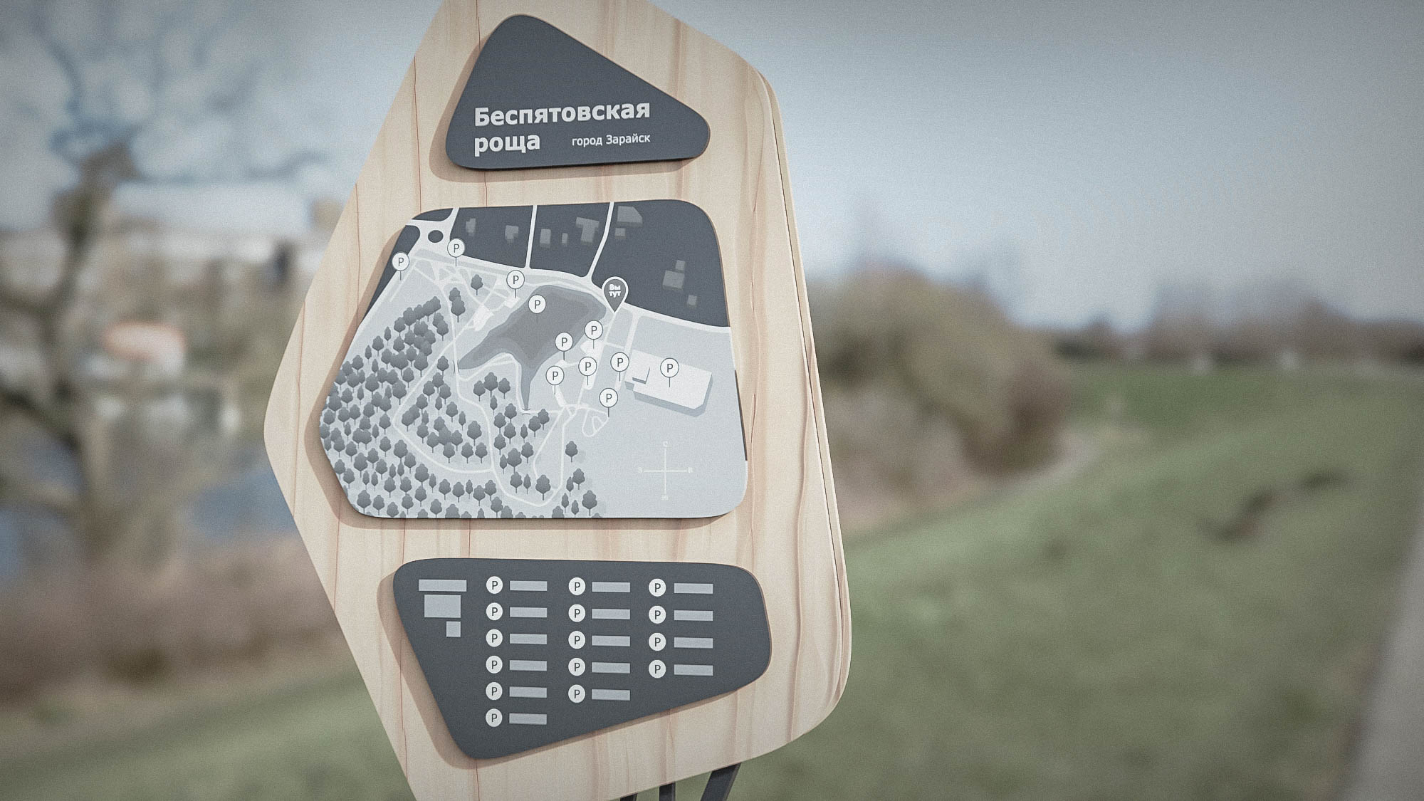Нам была поставлена задача: разработать ахроматическое решение для карты Беспятовской рощи. В установленные размеры стеллы необходимо поместить границы рощи и все важные элементы для ориентации в пространстве.