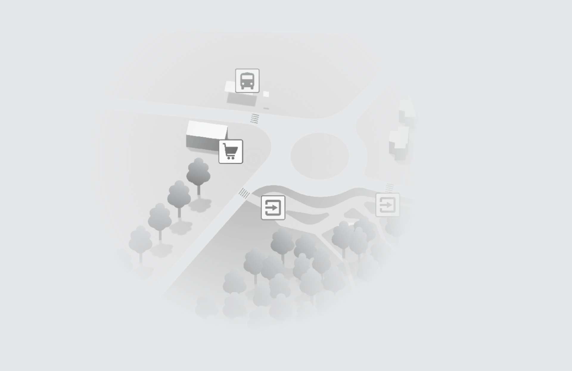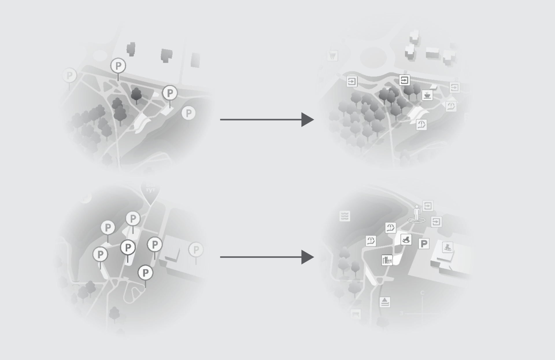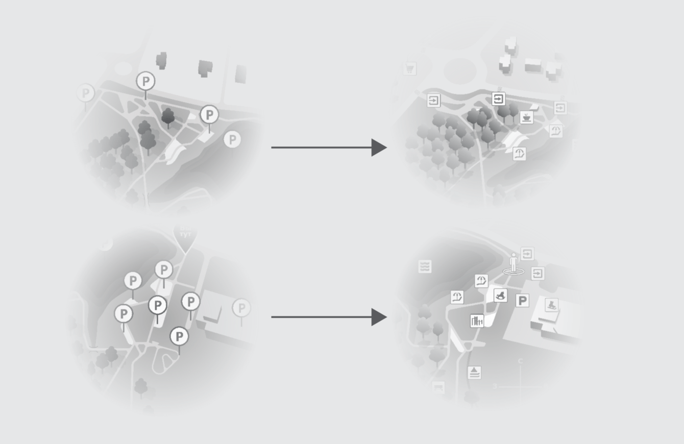 Мы выявили наиболее полезные элементы, которые позволяют человеку ориентироваться на местности. На карте мы показываем небольшой кусок города, чтобы пользователь навигации понимал положение рощи относительно других объектов города. Визуально лучше всего работает кусок с круговым движением.
