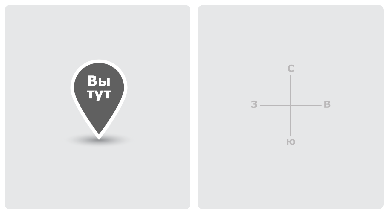 Необходима отметка «Вы тут». Она должны быть довольно контрастной. Это первое, что человек ищет на карте. Пока он не найдет себя на карте – поиски любых других объектов не имеют смысла, иначе не понятен вектор движения.