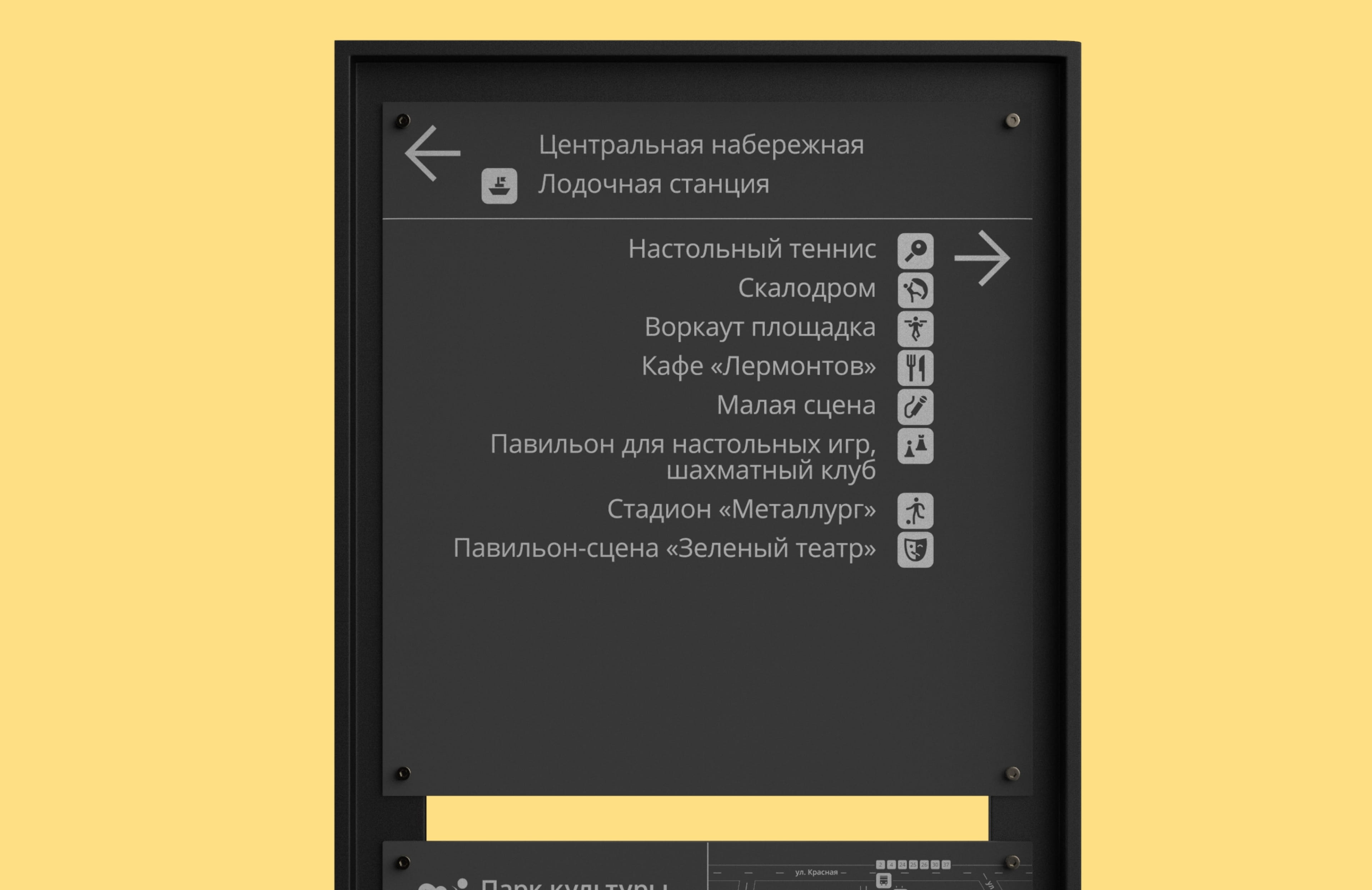 Мы использовали левое и правое выравнивание названий парковых зон, в зависимости от того, в какой стороне от стеллы они находятся. Вместе со знаком направления, указанного стрелкой, такое решение дополнительно упрощает ориентацию в парке.