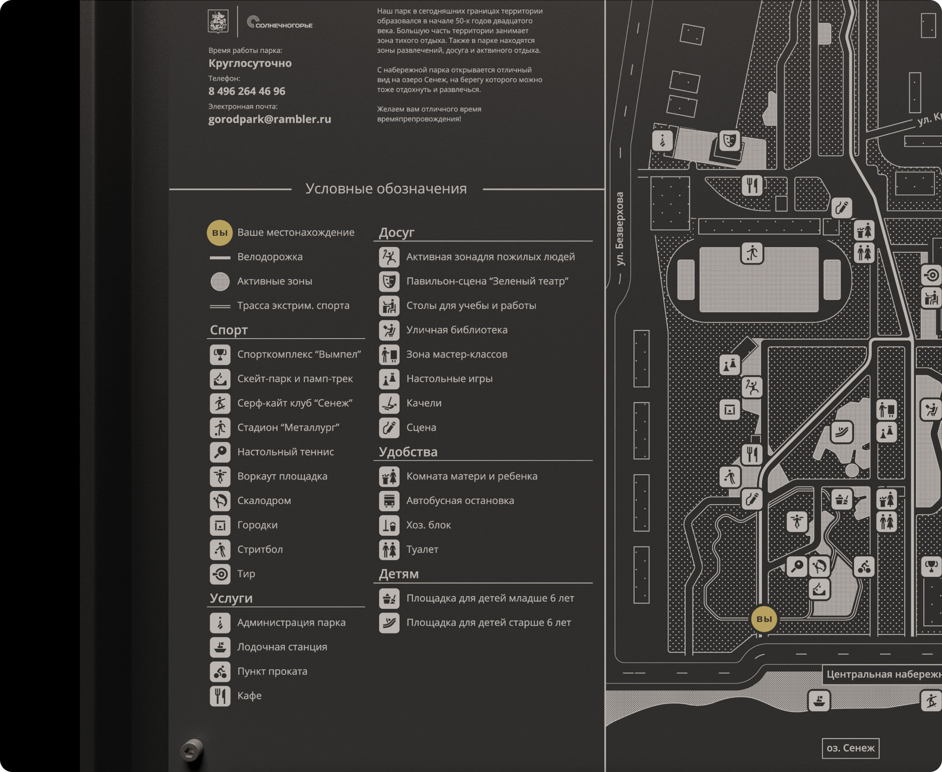 Система навигации была создана в рамках проекта модернизации Солнечногорского парка. Мы работали в сотрудничестве с компанией Mirror Group, которая занималась благоустройством парка.