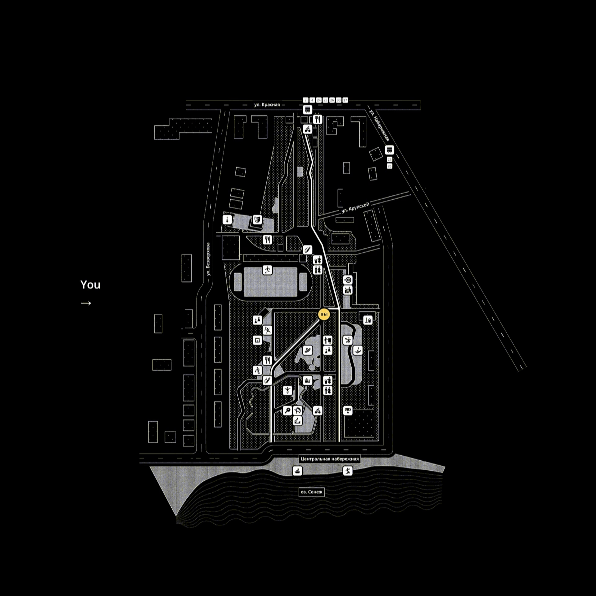 Схема парка легко воспринимается, так как выполнена в виде простых и приятных глазу форм. В качестве иконок парковых зон мы использовали те ассоциативные образы, которые будут понятны любому человеку.
