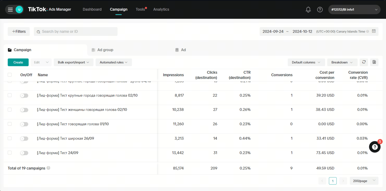 И вот первые трудности возникли сразу, в первые недели работы с платформой Tik-Tok - средняя цена за заявку была в районе 50 $ за конверсию. Этот показатель был критическим, ДАЖЕ несмотря на то, что лиды шли целевые.