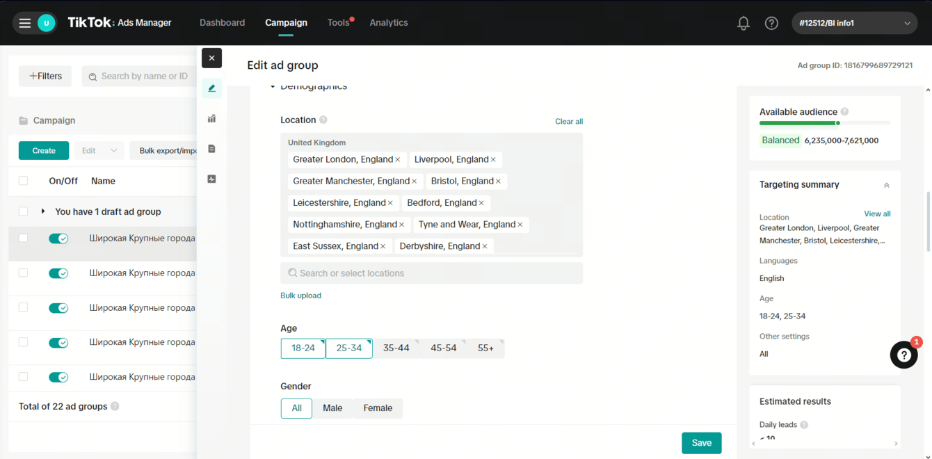 Дальше просто просилось сужение географии и возраста целевой аудитории в рекламной кампании. Основываясь на данных с рекламы Tik-Tok и Facebook/Instagram и углубленном анализе целевой аудитории были выбраны крупные регионы Англии, а также проведено сужение по возрасту вплоть до рамок с 18 до 34 лет, чтобы таким образом зацепить именно тех, кто с большей долей вероятности заинтересуются поступлением в топ 70 вузов Англии.