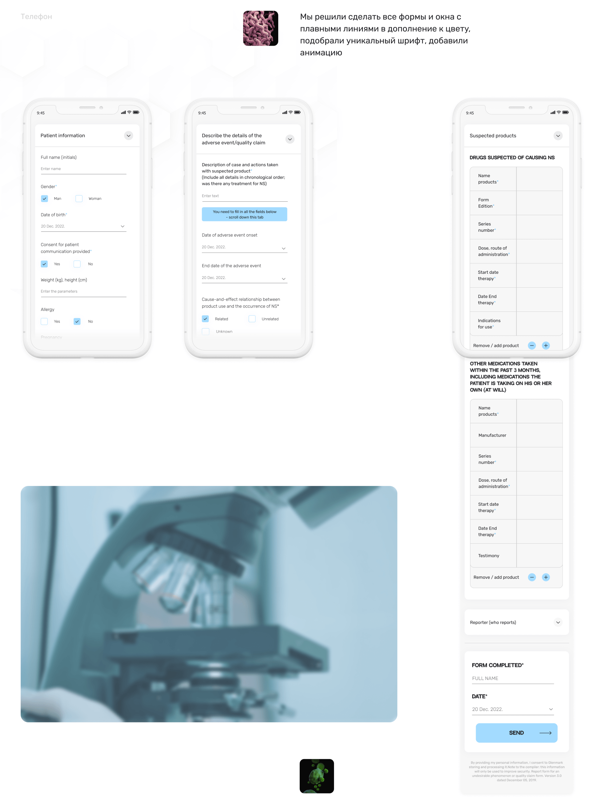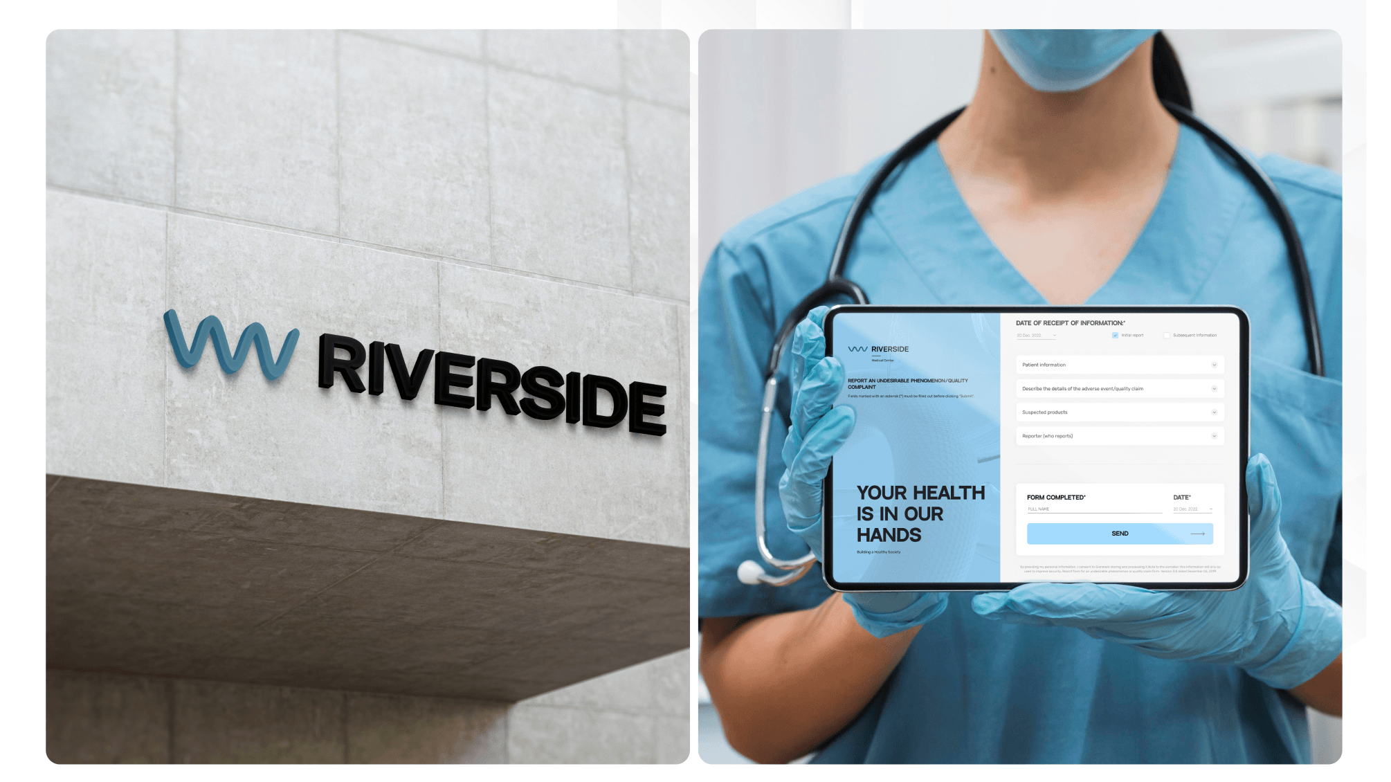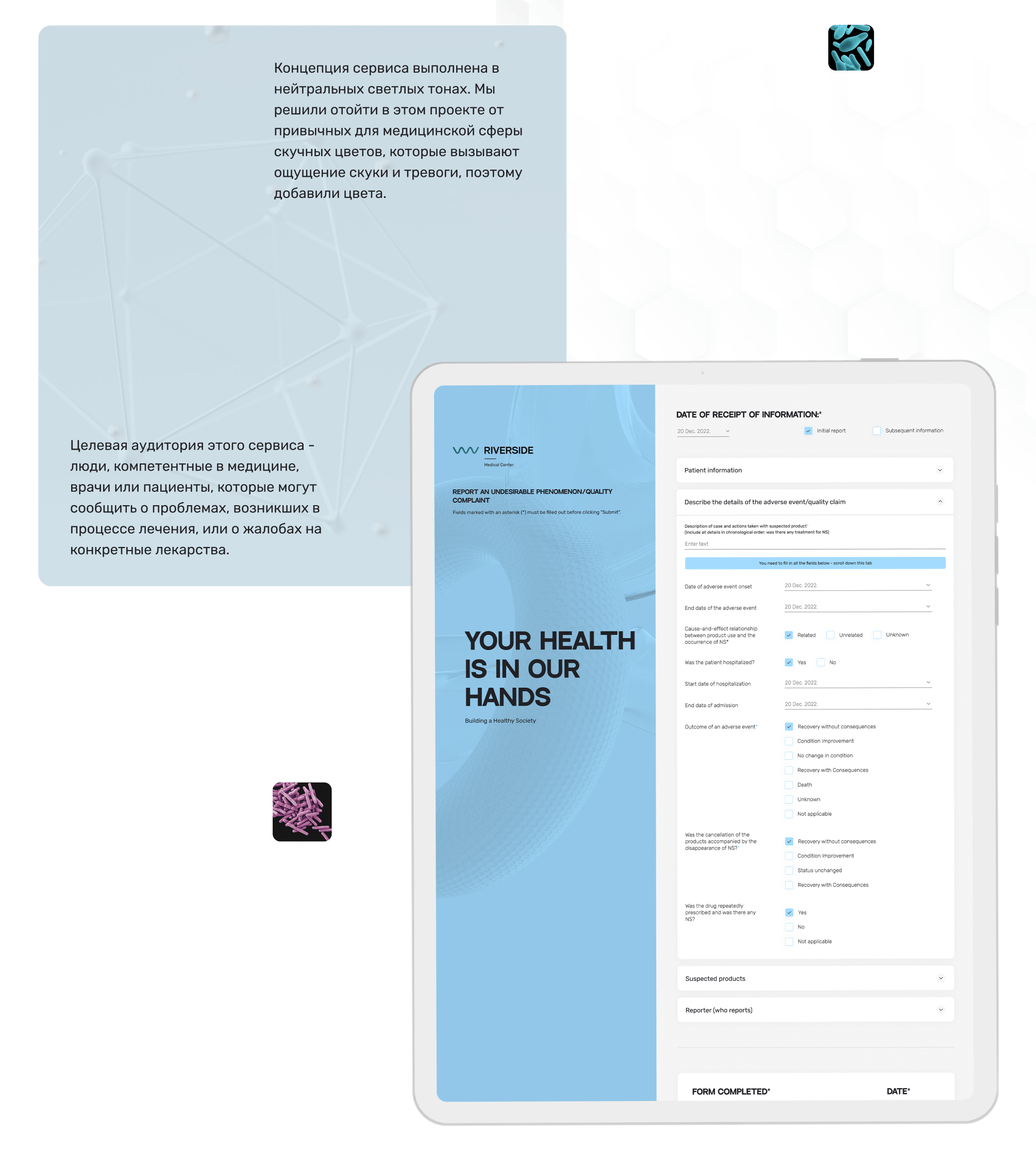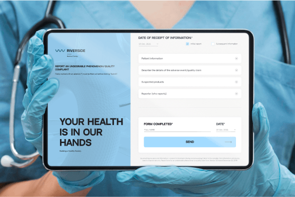 Разработать систему для сбора отзывов и жалоб в медицинском центре Riverside, которая позволит пациентам и медицинским специалистам удобно и быстро сообщать о проблемах с лечением или препаратами через терминал, используя современный, интуитивно понятный дизайн с акцентом на плавные линии, уникальный шрифт и анимации