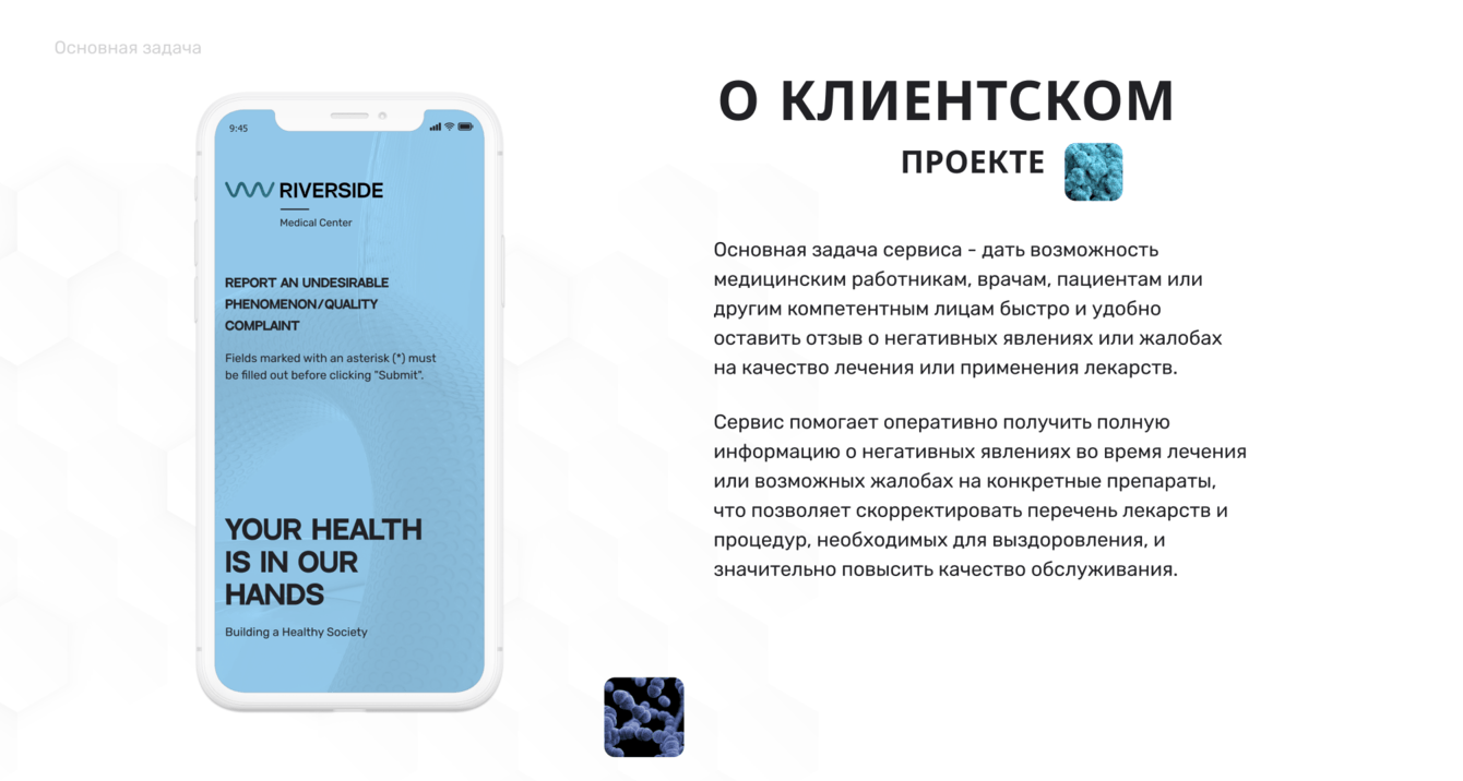 Мы начали разработку сервиса, фокусируясь на создании удобного и эффективного интерфейса, который позволит пациентам и медицинскому персоналу легко и быстро оставлять жалобы и отзывы , при этом обеспечивая комфорт и высокое качество обслуживания. Далее мы разработали прототип интерфейса, который учитывает потребности пользователей и включает плавные линии, уникальный шрифт и анимации для улучшения восприятия. Также внедрили механизмы для быстрого сбора и анализа данных о жалобах, чтобы оперативно реагировать на проблемы и улучшать качество медицинских услуг. На следующем этапе мы интегрировали систему с внутренними процессами медицинского центра, что позволило быстро обрабатывать жалобы и обновлять перечень лекарств и процедур для повышения качества лечения. В завершение мы провели финальное тестирование системы, убедившись в ее стабильной работе и простоте использования. После этого сервис был успешно внедрен в медицинском центре Riverside, обеспечив медицинскому персоналу и пациентам эффективный инструмент для быстрого и удобного обмена информацией о качестве лечения и лекарствах