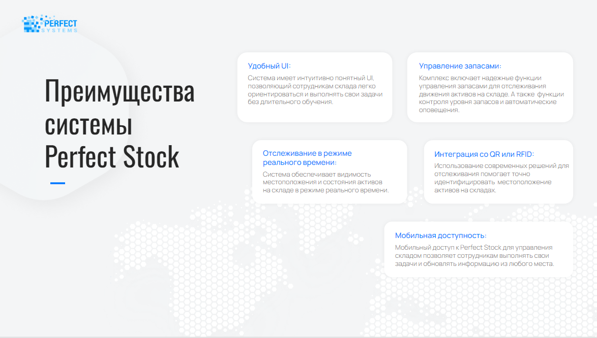 ■ Perfect Stock легко масштабируется для удовлетворения растущих потребностей бизнеса и достаточно гибок, чтобы адаптироваться к изменяющимся требованиям склада, таким как новые рабочие процессы или дополнительные места хранения.