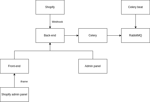 Всё это работало на монолитном back-end'e, который служил и API для панели администратора и обработчиком запросов Shopify. Фоновые задачи и ретраи были реализованы с использованием Celery.