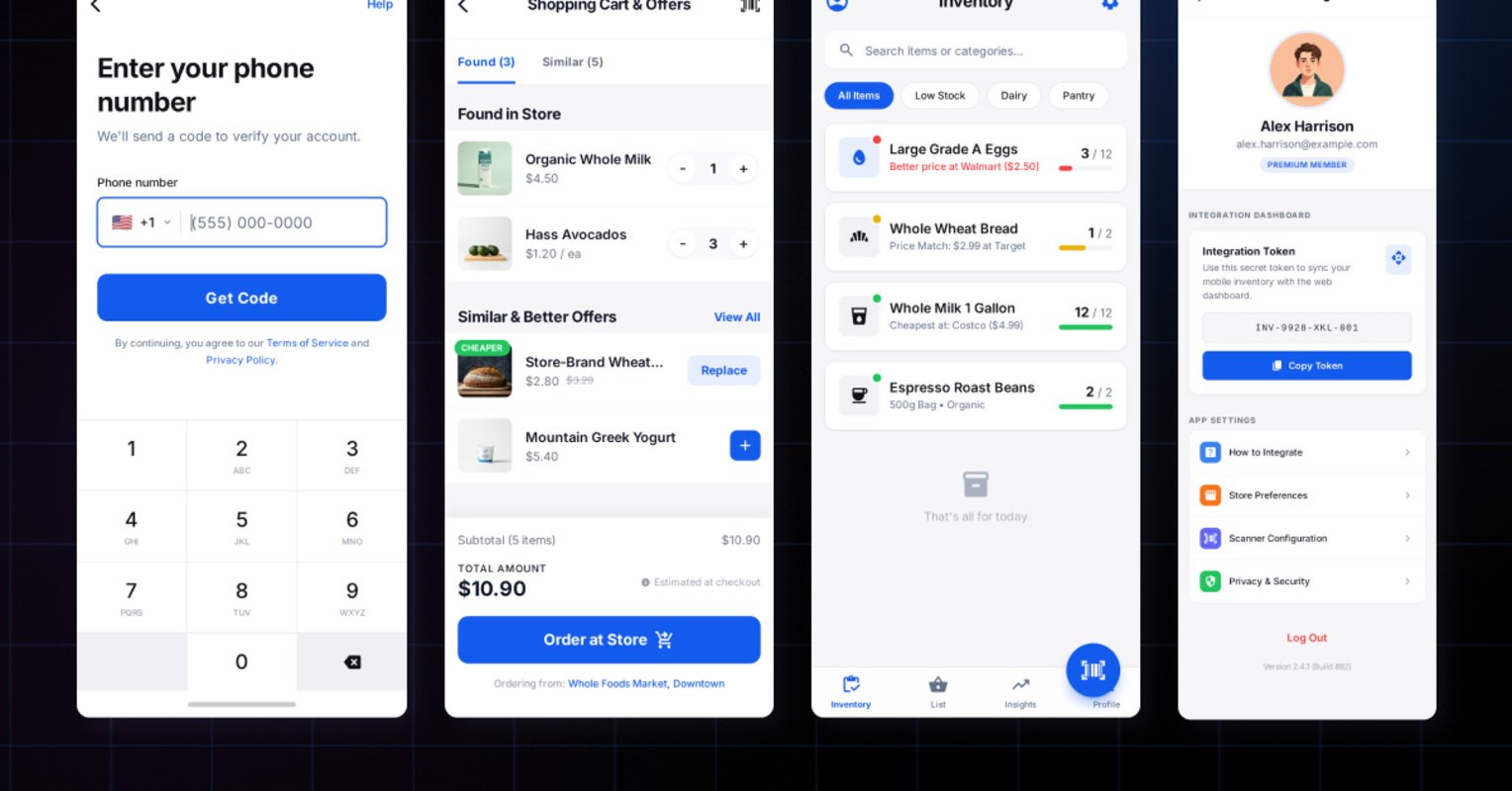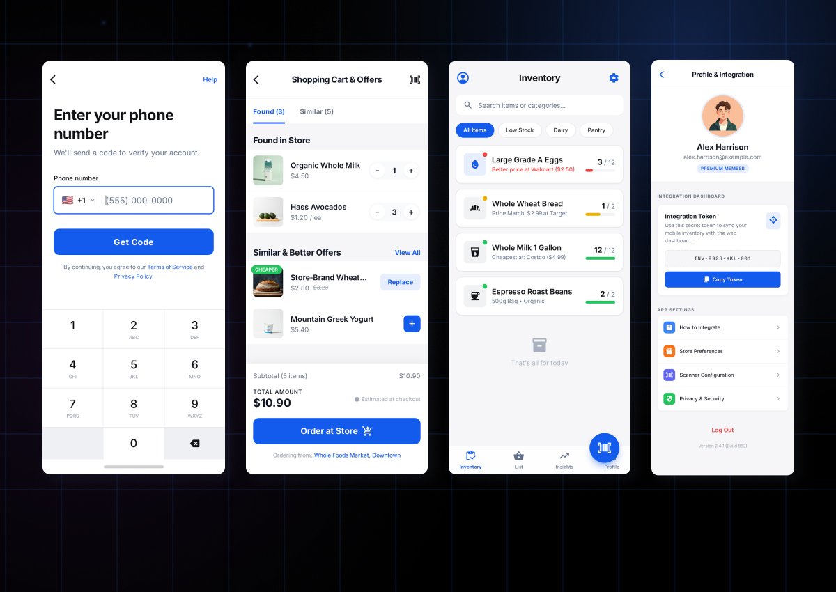 Результат: полнофункциональное MVP для iOS и Android, 12+ экранов, 9 API endpoints, 30+ UI-компонентов. Автоматизация контроля запасов, экономия времени при покупках, умный подбор альтернатив.