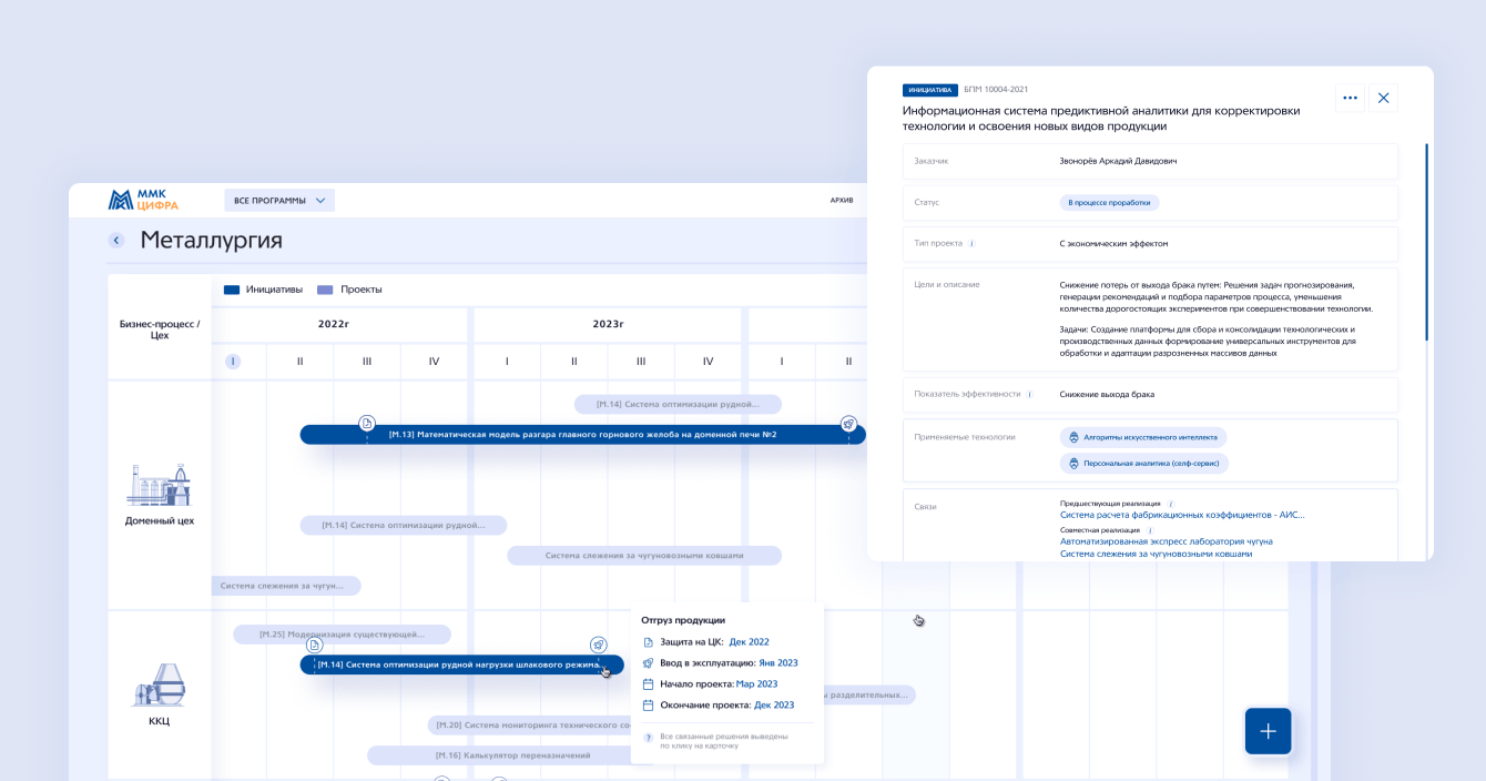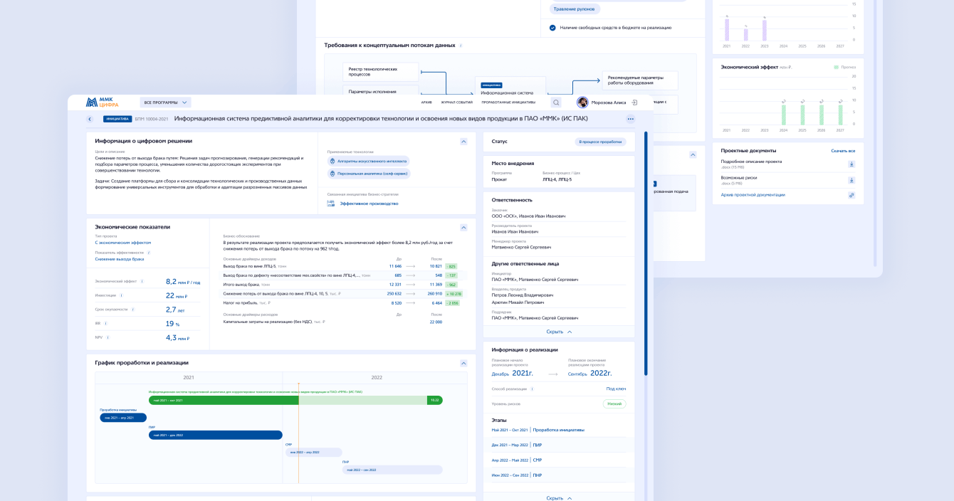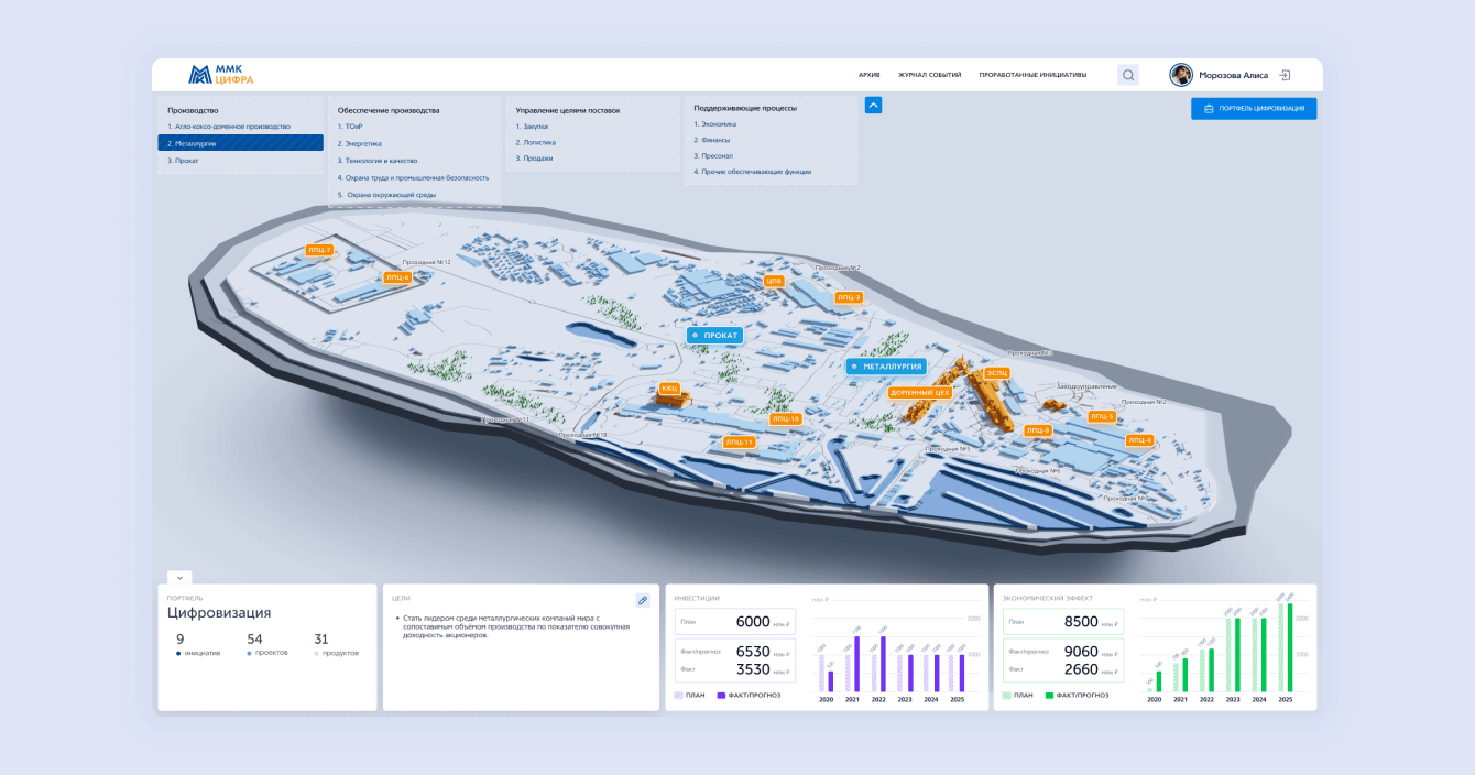 Новый сервис «Система управления цифровизацией» помог руководителям и ТОП-менеджменту вывести контроль и управление за цифровизацией группой компании ПАО «ММК» на новый уровень. Система помогла сформировать наглядное понимание хода цифровизации и вклада в достижение бизнес-целей направлений. Инвесторы получили доступ к прозрачной оценки и прогнозу инвестиций в программы цифровизации.