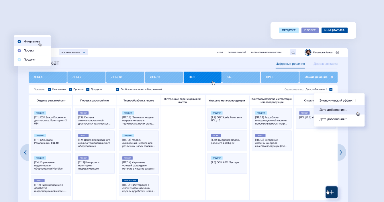 На карте цифровых решений есть возможность анализировать проекты, инициативы, продукты в разрезе производственных подразделений и сортировать их по экономической эффективности.