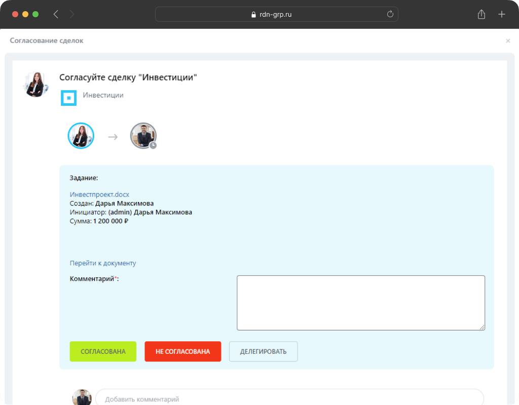 Это документ, который автоматически формируется в конце согласований как при положительном, так и при отрицательном исходе. Для этого RDN Group научили процессы в ленте работать с генератором документов. Данный функционал позволяет в удобной форме передать руководству документы на подписание.