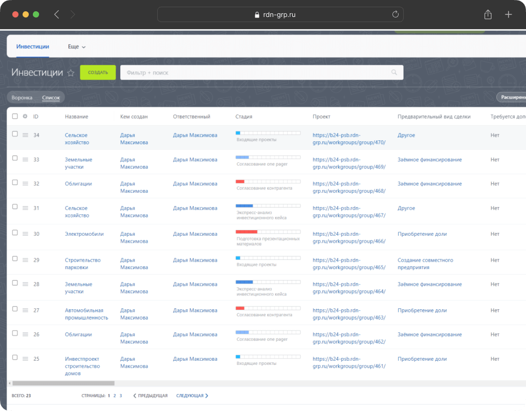 Отдельный важный блок платформы занимают инвестиционные проекты. Для удобной работы по инвестиционным проектам в Битрикс24 были выполнены следующие настройки: