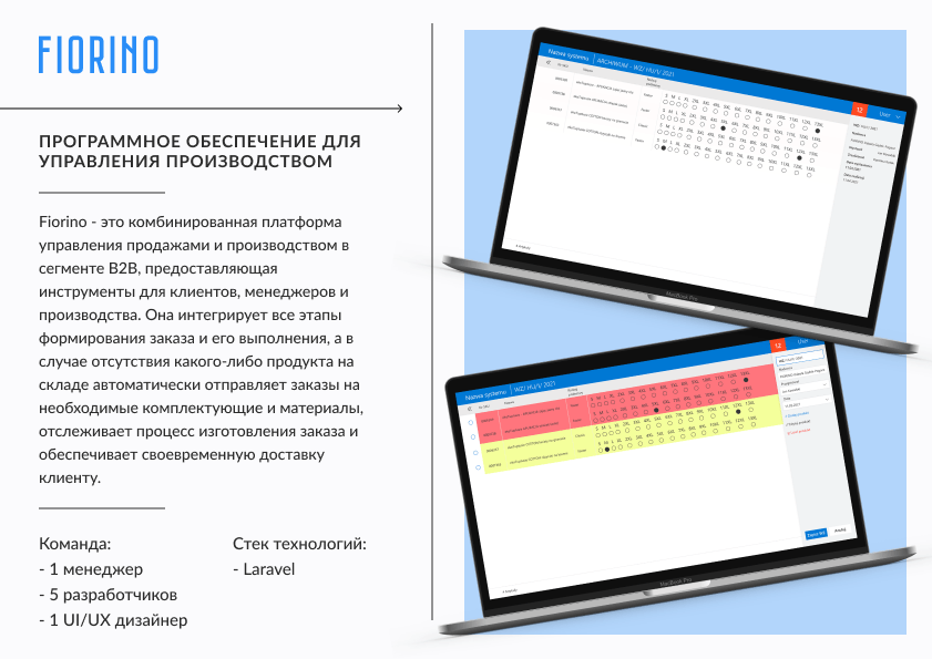 Fiorino – ERP-система для эффективной организации использования ресурсов компании. Клиенты напрямую общаются с менеджерами склада и сотрудниками производства. Программа ускоряет процесс работы в несколько раз. Основное преимущество: рентабельное количество производимой продукции, нет переполненности складов, нет дефицита заказов.