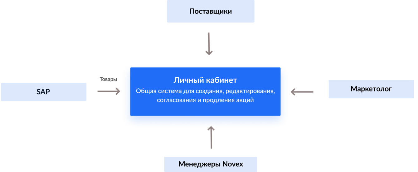 У Novex есть свой отлаженный и работающий процесс создания и согласования акций, на котором завязаны важнейшие бизнес-процессы. Но он не ложился ровно на имеющиеся готовые решения. Процесс нужно было оцифровать и автоматизировать. Для этого нужно разработать кастомное решение: общий личный кабинет для маркетологов, поставщиков и категорийных менеджеров, который оптимизирует бизнес-процессы и экономит время для всех участников цепочки.
