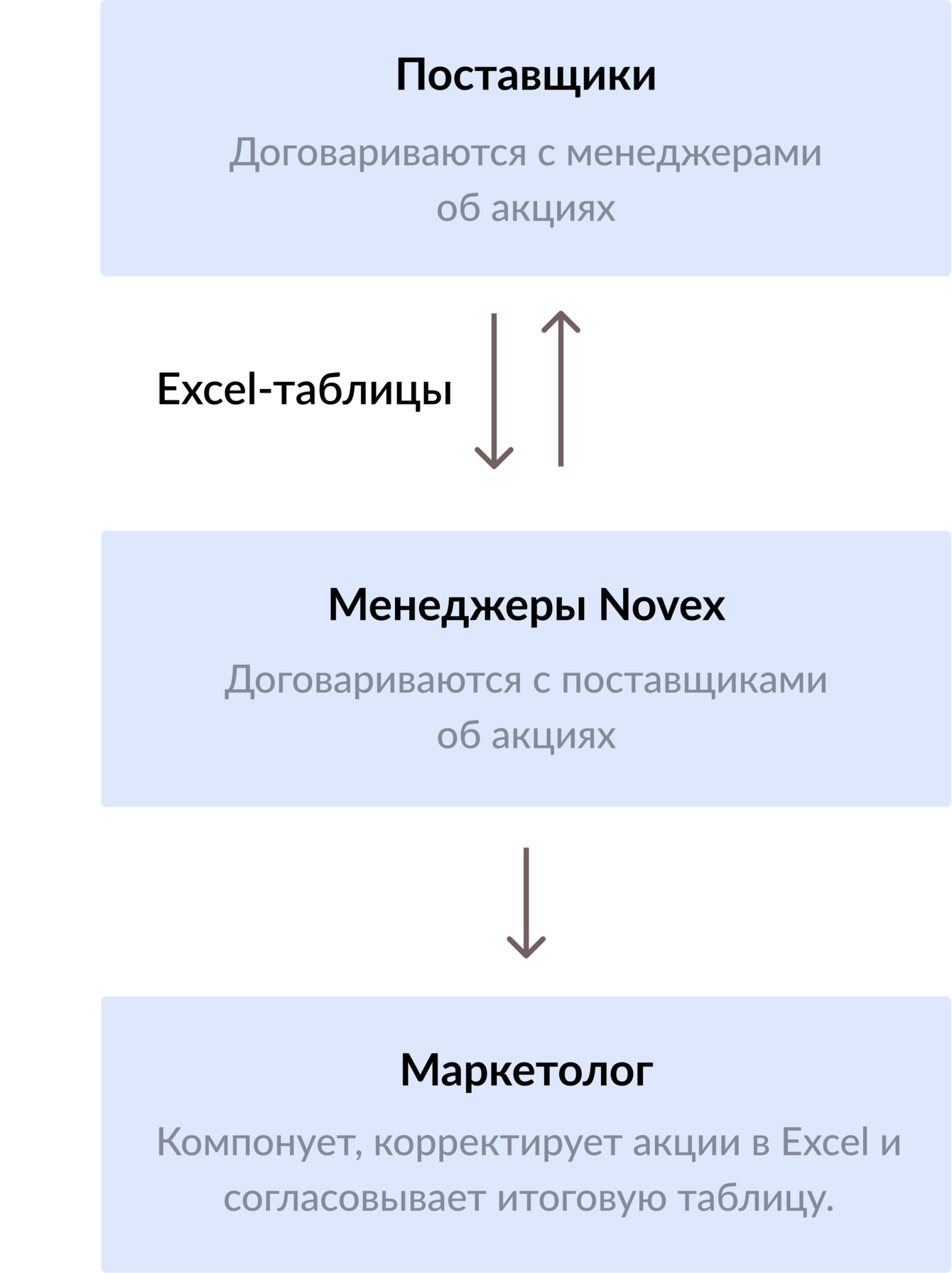 Novex в течение года договаривается с сотней поставщиков для проведения акций по разным каналам. Менеджеры и поставщики обмениваются тысячами файлов Excel за год, которые отдел маркетинга обрабатывает и формализует в единую акцию, сводит и согласовывает все условия.