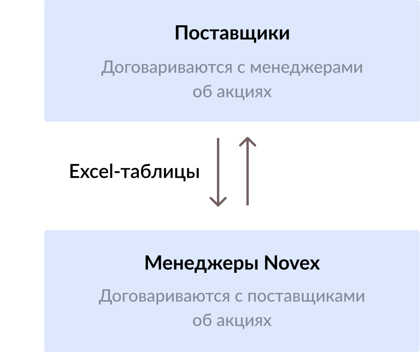 До того, как мы начали разработку системы, процесс обмена данными выглядел так: поставщики договариваются с менеджерами Novex о проводимых акциях и обмениваются файлами Excel, в которых эти акции фиксируют. Сложность в том, что таблиц может быть очень много. Например, поставщик может прислать один файл с акциями, а через 5 минут еще один, уже скорректированный.