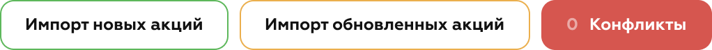 Конфликты. Если при загрузке акций какие-то из них дублируются (уже есть в системе), то это подсвечивается в специальном окне «конфликты». Там можно отсмотреть и решить все конфликты с помощью соответствующих кнопок.